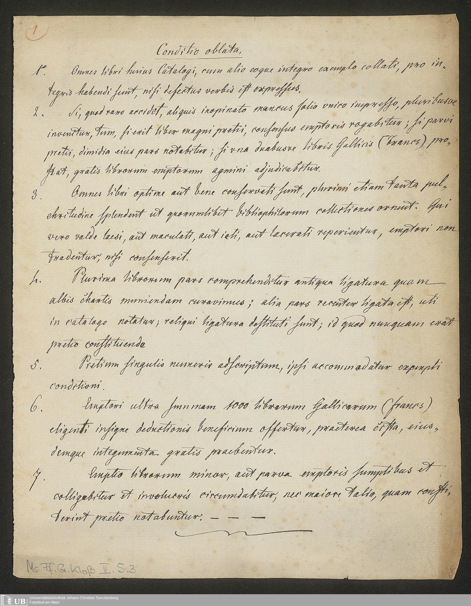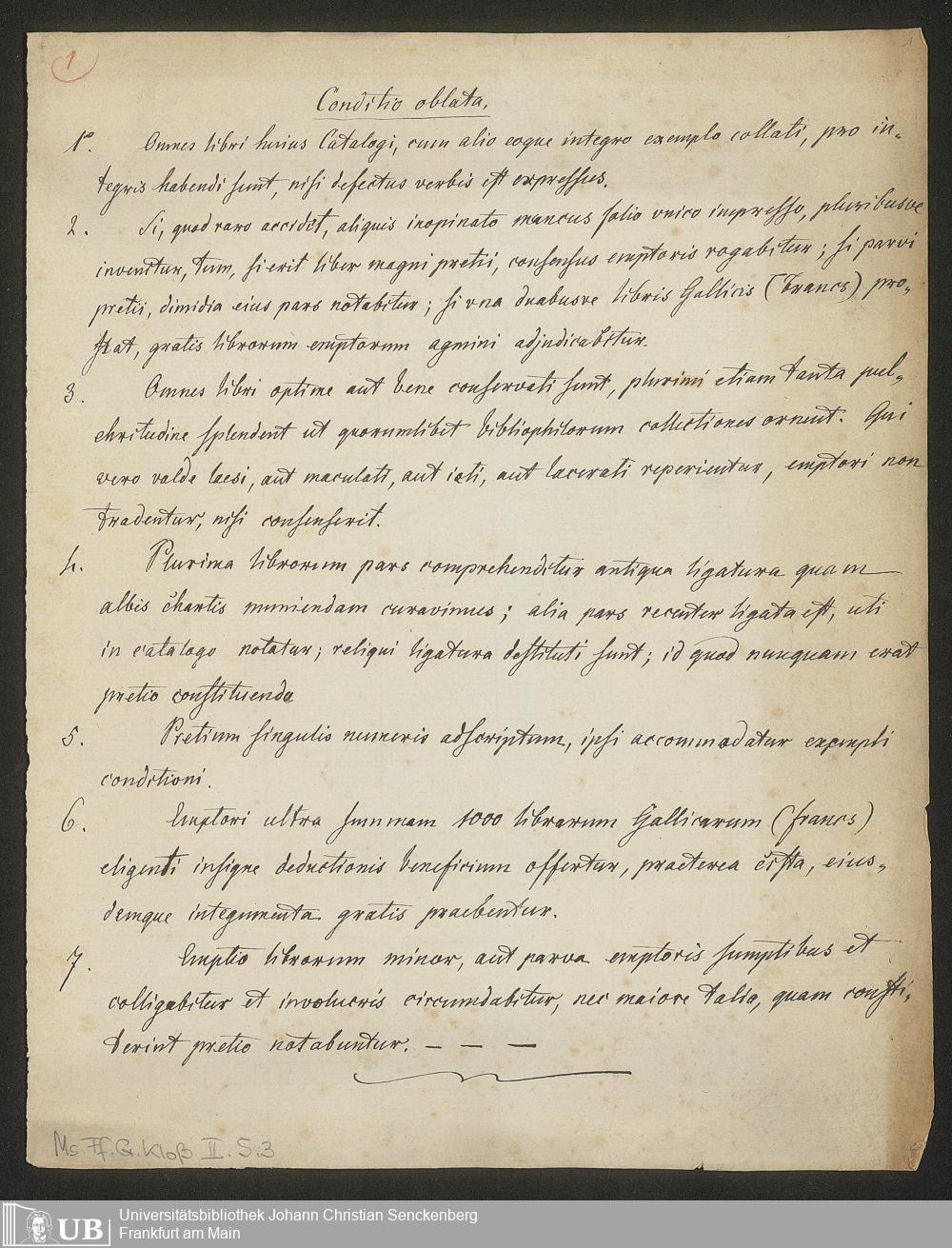 Ms. Ff. G. Kloß II.5.3 - Handschriftlicher Verkaufskatalog