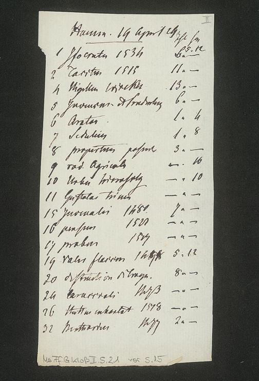 Ms. Ff. G. Kloß II.5.2.1 - Catalogue d'une petite collection de livres fort rares, imprimés la plupart au XV. Siècle, dont la vente se fera publiquement pardevant le commissionaire vendeur Reinold le 15. Avril 1829 à Hamm, Comté de la Mark, en Westphalie