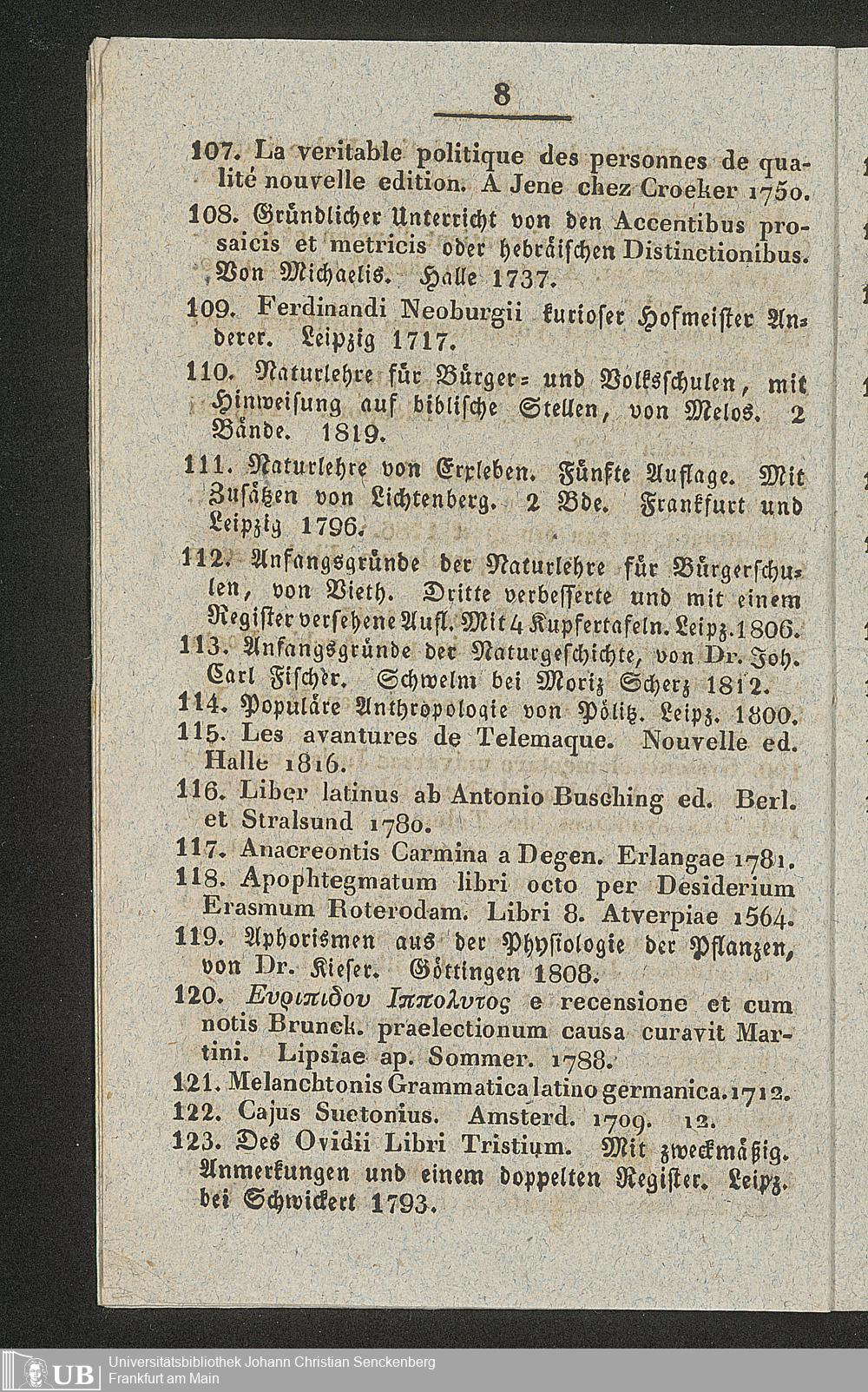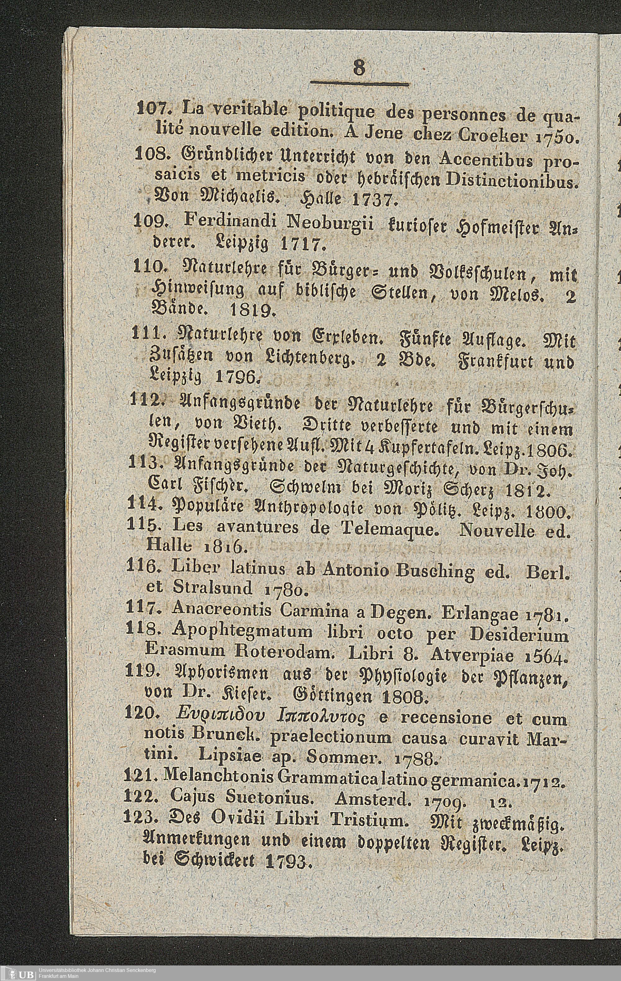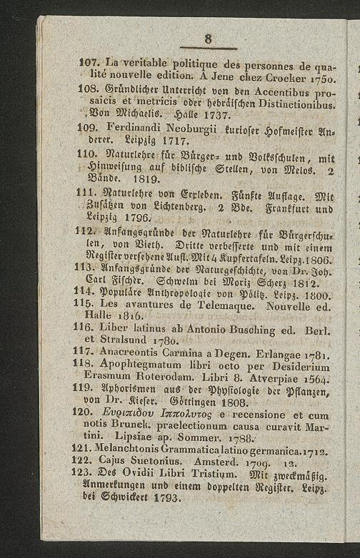 Ms. Ff. G. Kloß II.5.2.2 - Verzeichniss einer Sammlung grösstentheils wichtiger und gut gehaltener Bücher aus verschiedenen Zweigen der Wissenschaften, welche am 1. Mai 1830 und folgende Tage zu Hamm in der Grafschaft Mark durch den damit beauftragten Commissar Reinold gegen baare Zahlung meistbietend verkauft werden sollen