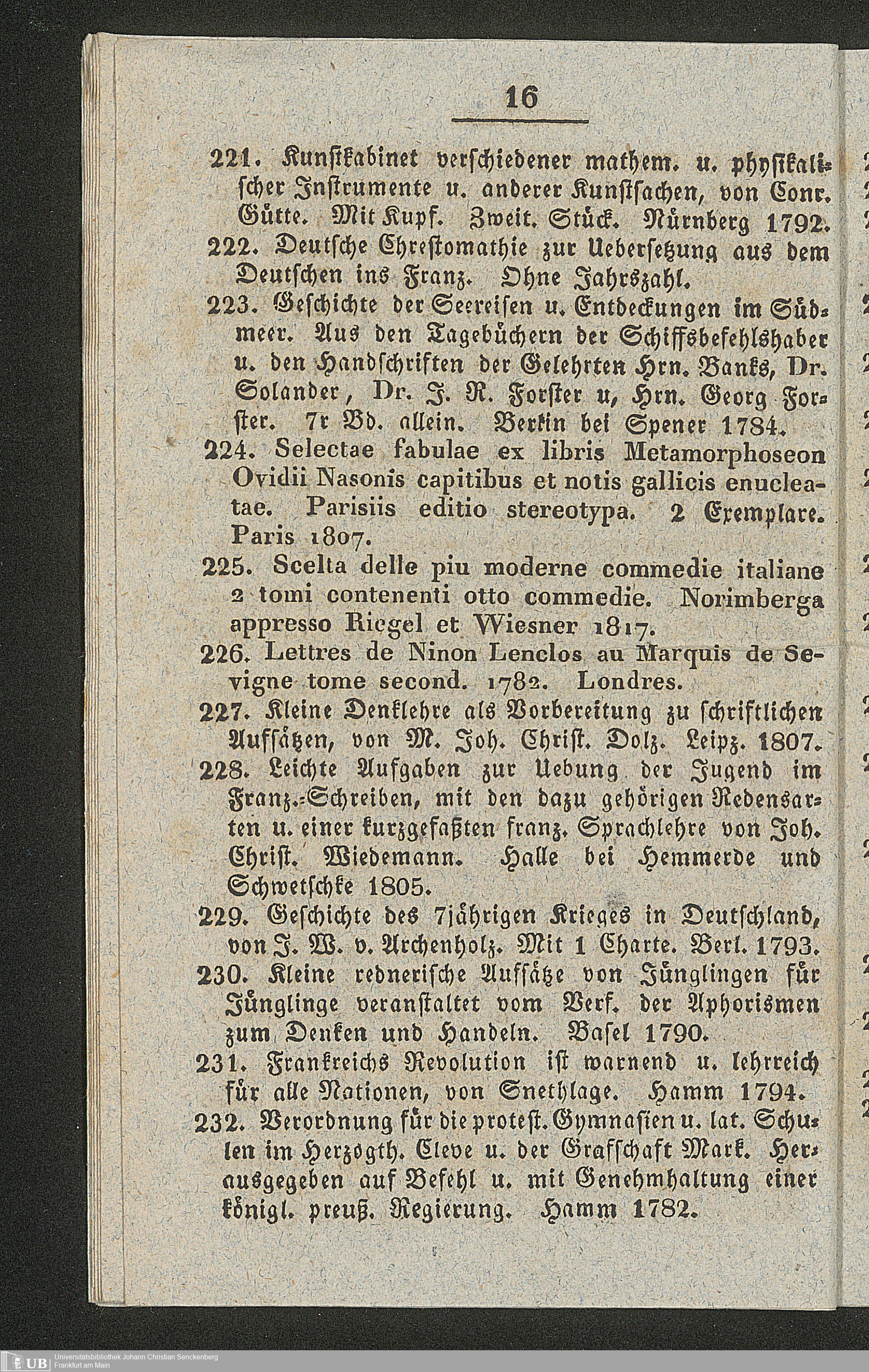 Ms. Ff. G. Kloß II.5.2.2 - Verzeichniss einer Sammlung grösstentheils wichtiger und gut gehaltener Bücher aus verschiedenen Zweigen der Wissenschaften, welche am 1. Mai 1830 und folgende Tage zu Hamm in der Grafschaft Mark durch den damit beauftragten Commissar Reinold gegen baare Zahlung meistbietend verkauft werden sollen
