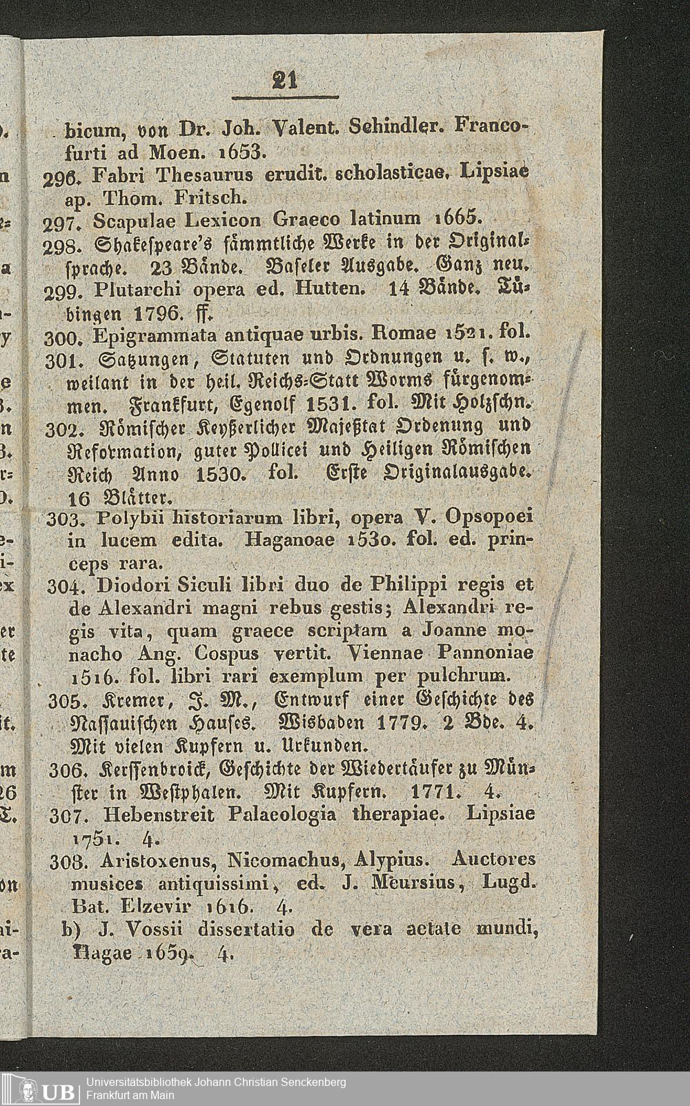 Ms. Ff. G. Kloß II.5.2.2 - Verzeichniss einer Sammlung grösstentheils wichtiger und gut gehaltener Bücher aus verschiedenen Zweigen der Wissenschaften, welche am 1. Mai 1830 und folgende Tage zu Hamm in der Grafschaft Mark durch den damit beauftragten Commissar Reinold gegen baare Zahlung meistbietend verkauft werden sollen