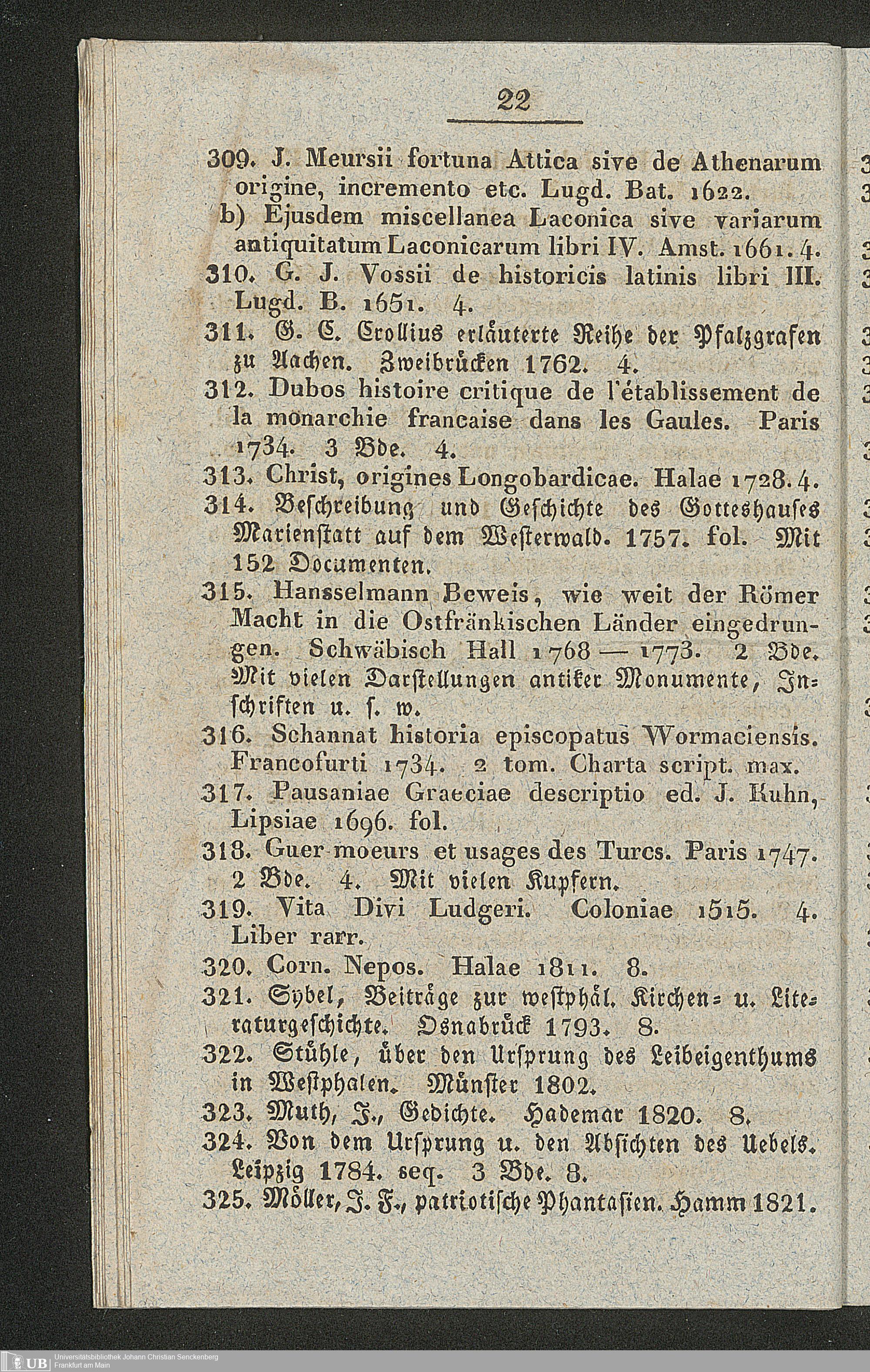 Ms. Ff. G. Kloß II.5.2.2 - Verzeichniss einer Sammlung grösstentheils wichtiger und gut gehaltener Bücher aus verschiedenen Zweigen der Wissenschaften, welche am 1. Mai 1830 und folgende Tage zu Hamm in der Grafschaft Mark durch den damit beauftragten Commissar Reinold gegen baare Zahlung meistbietend verkauft werden sollen