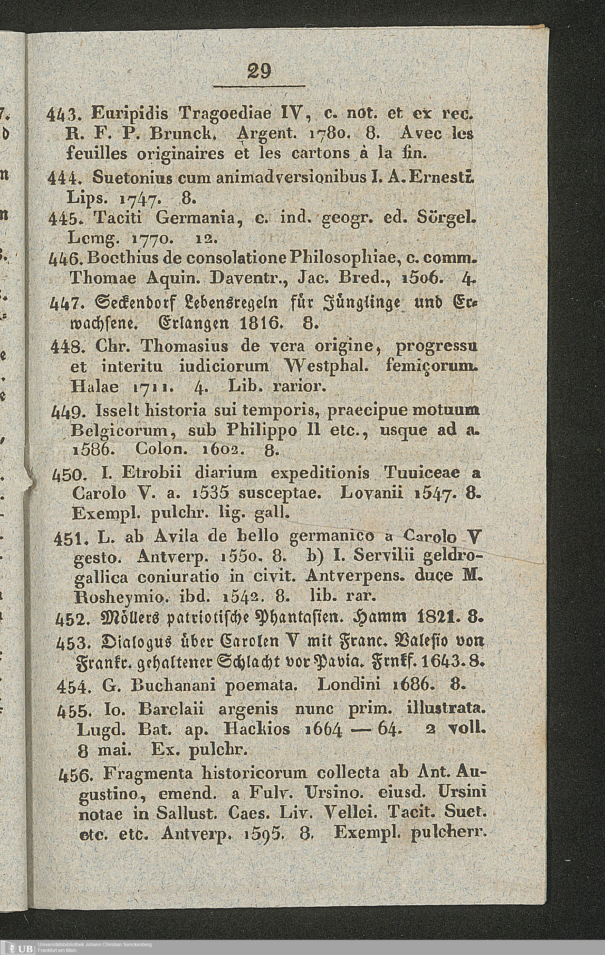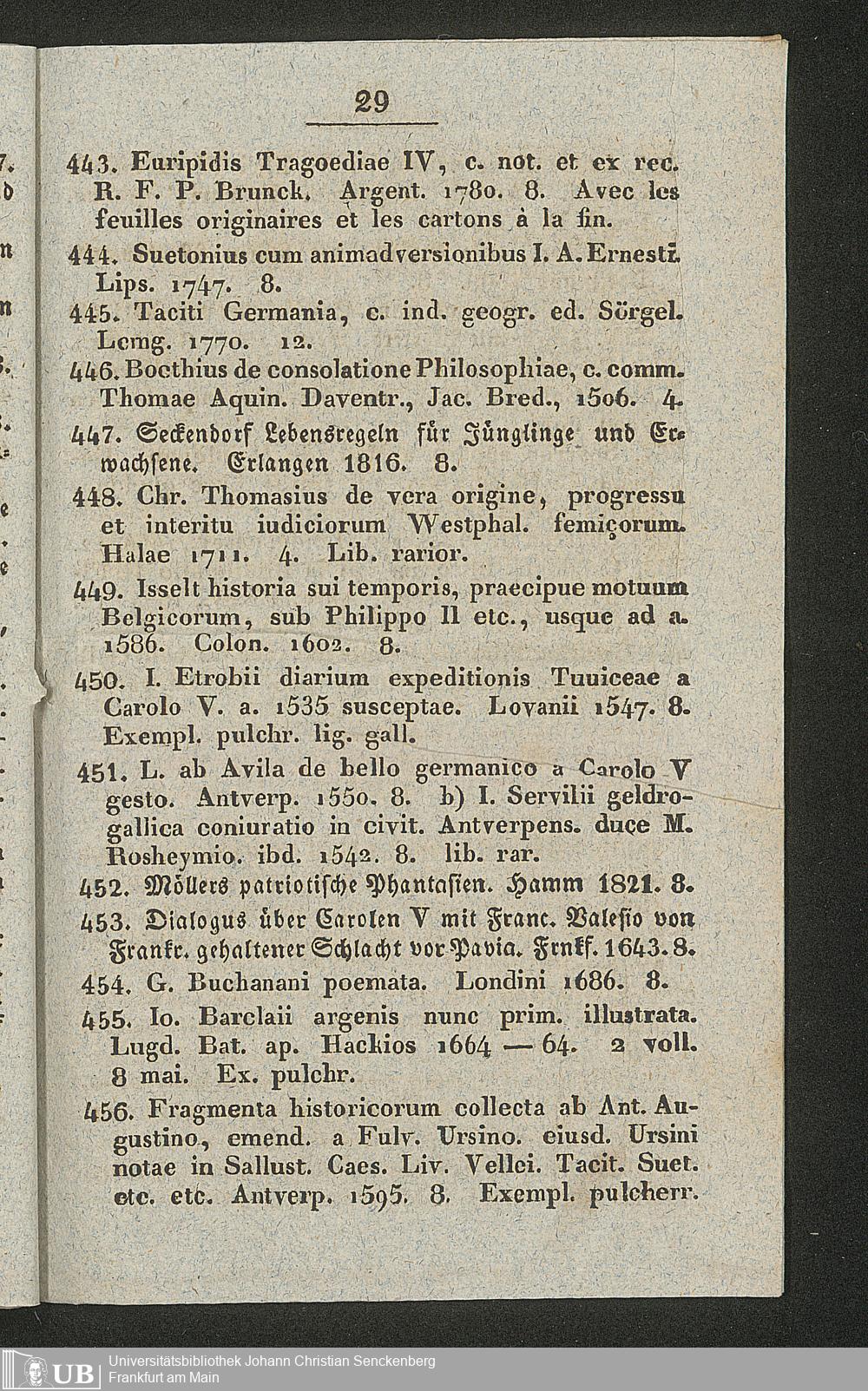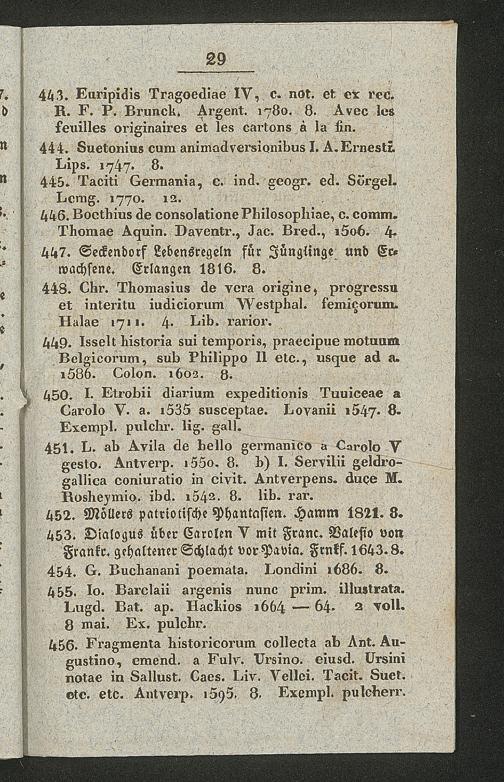Ms. Ff. G. Kloß II.5.2.2 - Verzeichniss einer Sammlung grösstentheils wichtiger und gut gehaltener Bücher aus verschiedenen Zweigen der Wissenschaften, welche am 1. Mai 1830 und folgende Tage zu Hamm in der Grafschaft Mark durch den damit beauftragten Commissar Reinold gegen baare Zahlung meistbietend verkauft werden sollen