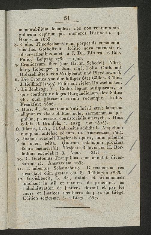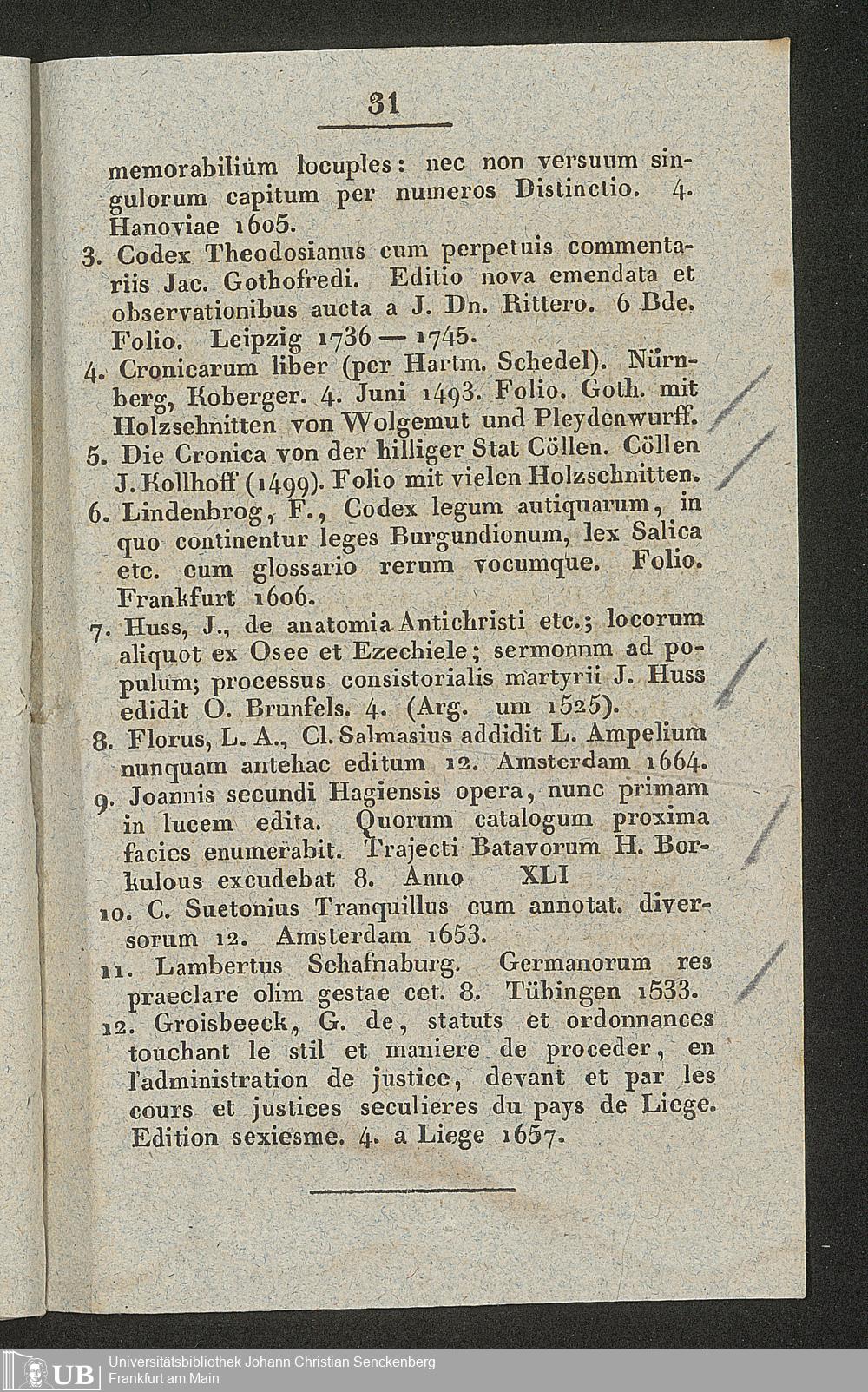 Ms. Ff. G. Kloß II.5.2.2 - Verzeichniss einer Sammlung grösstentheils wichtiger und gut gehaltener Bücher aus verschiedenen Zweigen der Wissenschaften, welche am 1. Mai 1830 und folgende Tage zu Hamm in der Grafschaft Mark durch den damit beauftragten Commissar Reinold gegen baare Zahlung meistbietend verkauft werden sollen