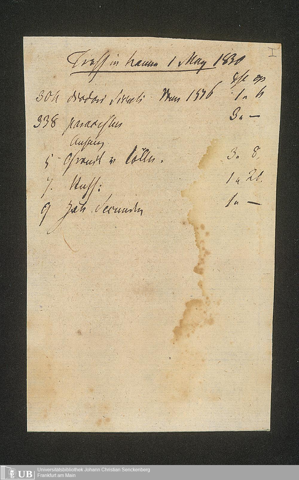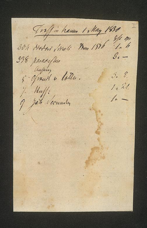 Ms. Ff. G. Kloß II.5.2.2 - Verzeichniss einer Sammlung grösstentheils wichtiger und gut gehaltener Bücher aus verschiedenen Zweigen der Wissenschaften, welche am 1. Mai 1830 und folgende Tage zu Hamm in der Grafschaft Mark durch den damit beauftragten Commissar Reinold gegen baare Zahlung meistbietend verkauft werden sollen