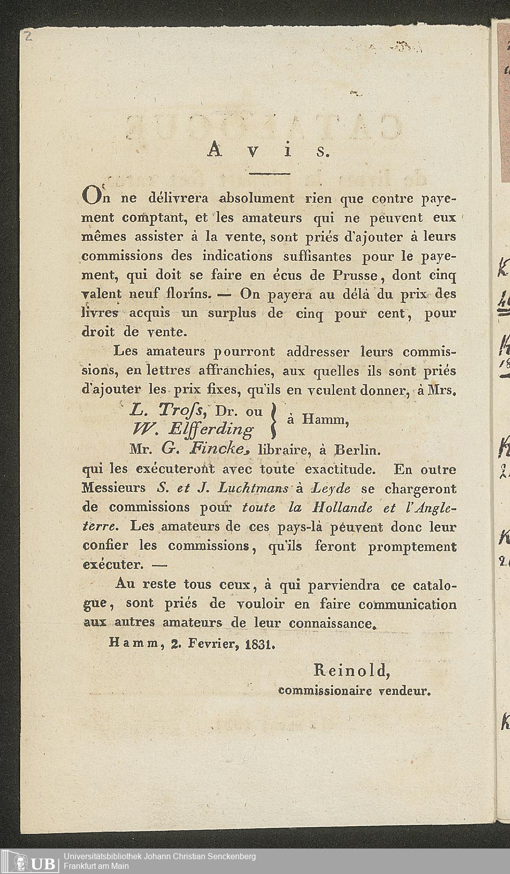 Ms. Ff. G. Kloß II.5.2.3 - Catalogue de livres la plupart fort rares, imprimés la plupart au XV. siècle, et de quelques Manuscrits interessans, dont la vente publique se fera pardevant le commissionaire vendeur Reinold le 26. Mars 1831 à Hamm, Comté de Mark, en Westphalie