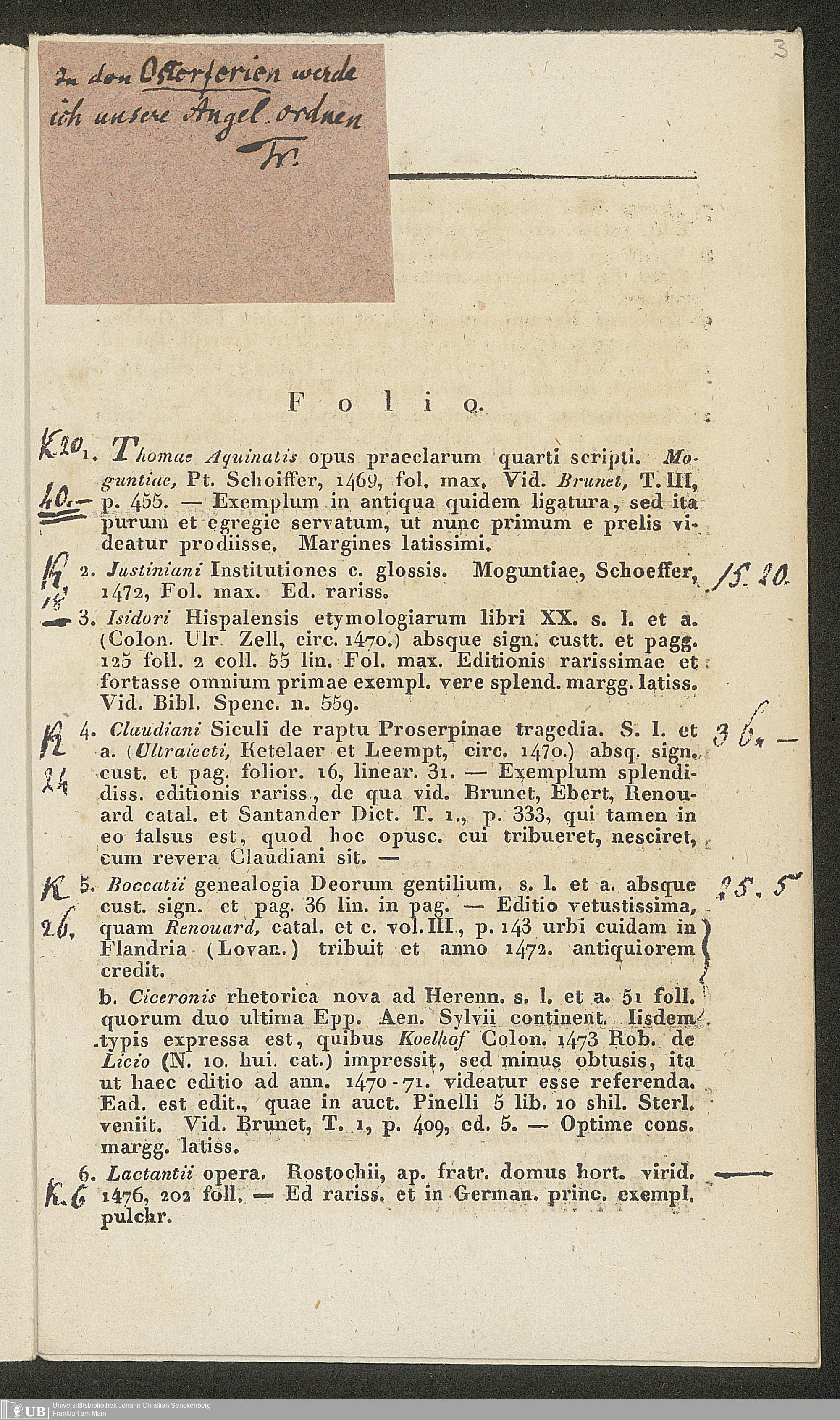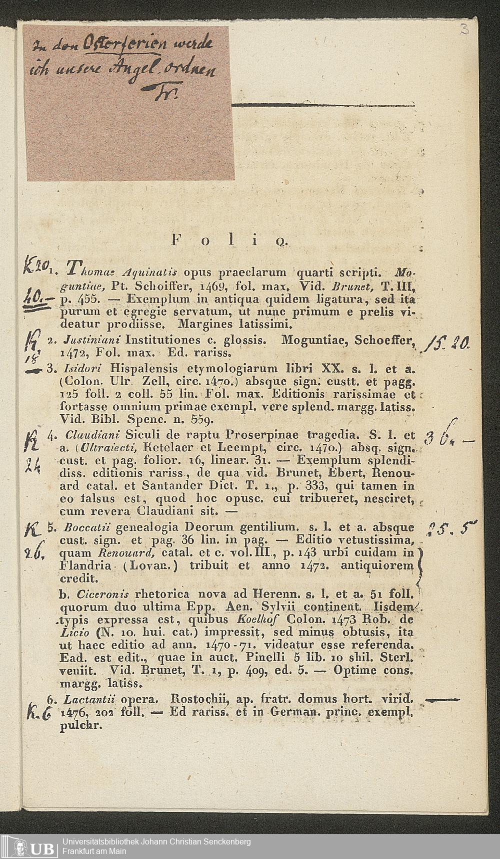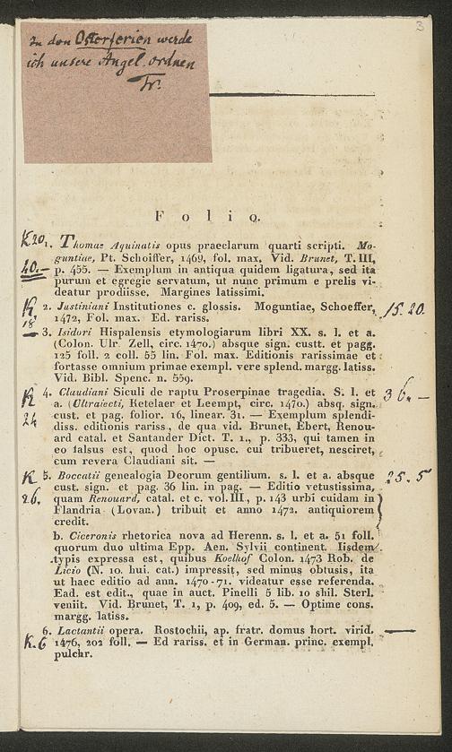 Ms. Ff. G. Kloß II.5.2.3 - Catalogue de livres la plupart fort rares, imprimés la plupart au XV. siècle, et de quelques Manuscrits interessans, dont la vente publique se fera pardevant le commissionaire vendeur Reinold le 26. Mars 1831 à Hamm, Comté de Mark, en Westphalie