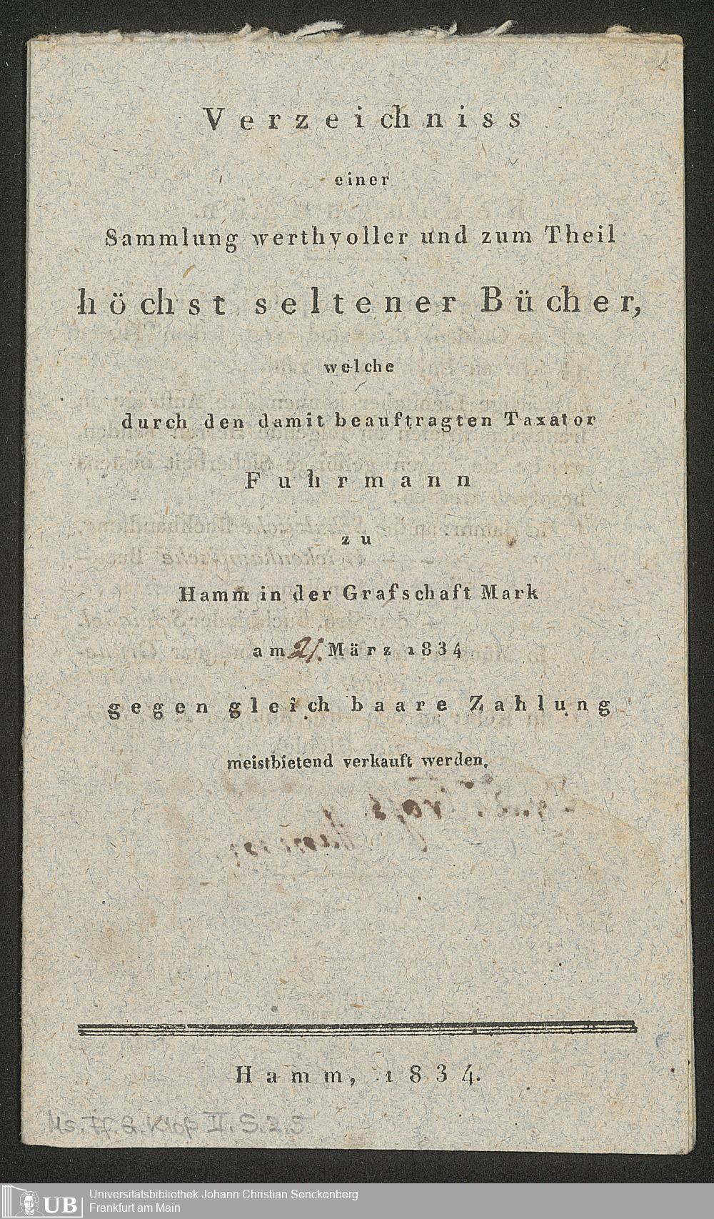 Ms. Ff. G. Kloß II.5.2.5 - Verzeichniss einer Sammlung werthvoller und zum Theil höchst seltener Bücher, welche durch den damit beauftragten Taxator Fuhrmann zu Hamm in der Grafschaft Mark am 21. März 1834 gegen gleich baare Zahlung meistbietend verkauft werden