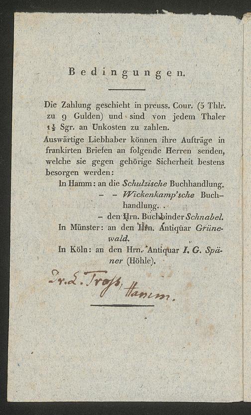 Ms. Ff. G. Kloß II.5.2.5 - Verzeichniss einer Sammlung werthvoller und zum Theil höchst seltener Bücher, welche durch den damit beauftragten Taxator Fuhrmann zu Hamm in der Grafschaft Mark am 21. März 1834 gegen gleich baare Zahlung meistbietend verkauft werden