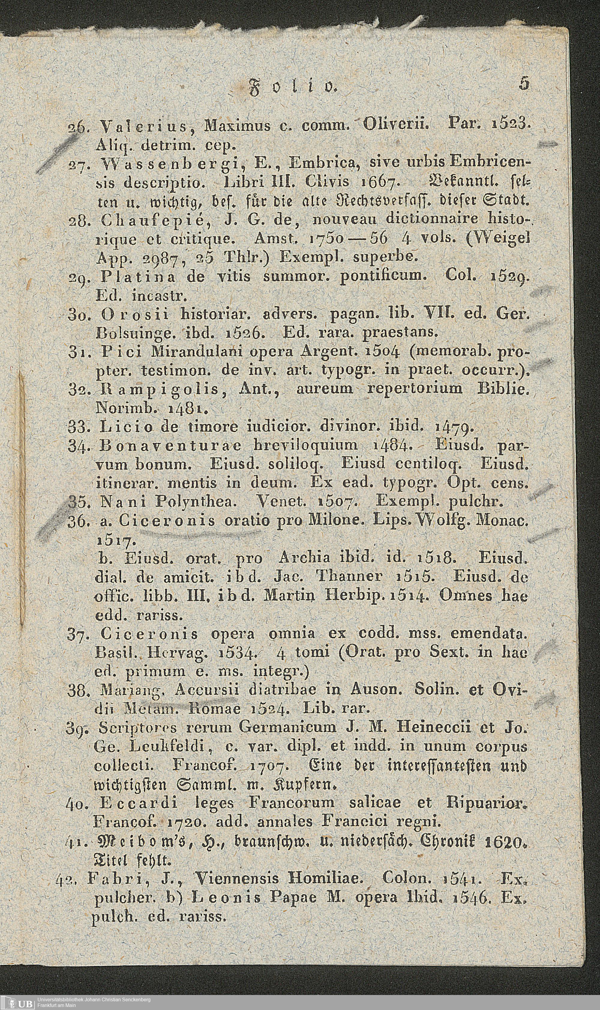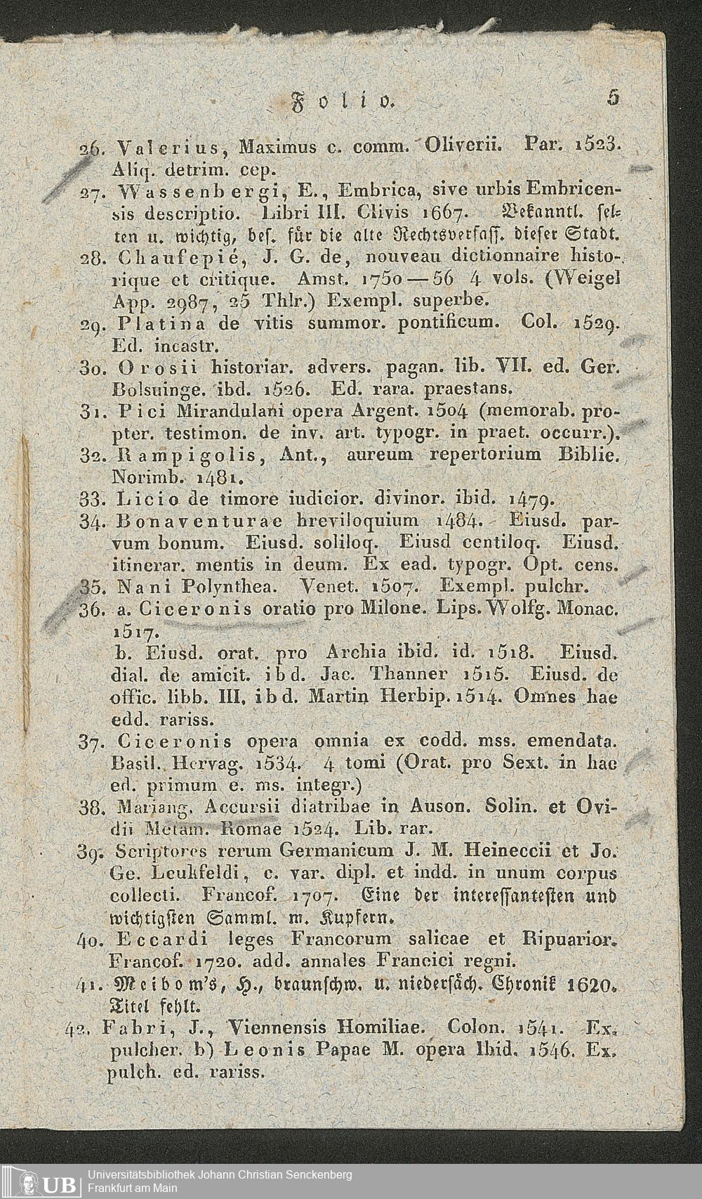 Ms. Ff. G. Kloß II.5.2.5 - Verzeichniss einer Sammlung werthvoller und zum Theil höchst seltener Bücher, welche durch den damit beauftragten Taxator Fuhrmann zu Hamm in der Grafschaft Mark am 21. März 1834 gegen gleich baare Zahlung meistbietend verkauft werden