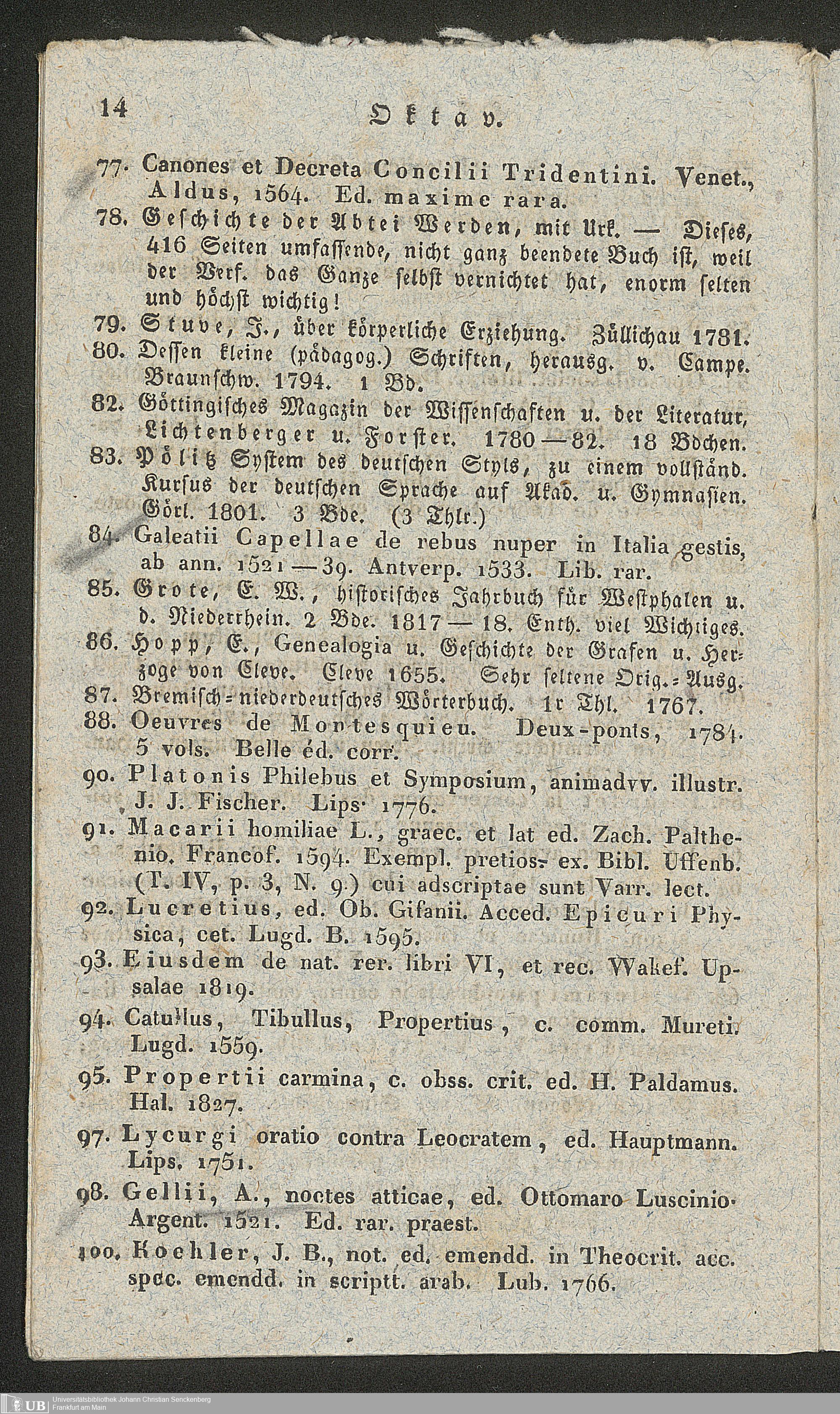 Ms. Ff. G. Kloß II.5.2.5 - Verzeichniss einer Sammlung werthvoller und zum Theil höchst seltener Bücher, welche durch den damit beauftragten Taxator Fuhrmann zu Hamm in der Grafschaft Mark am 21. März 1834 gegen gleich baare Zahlung meistbietend verkauft werden