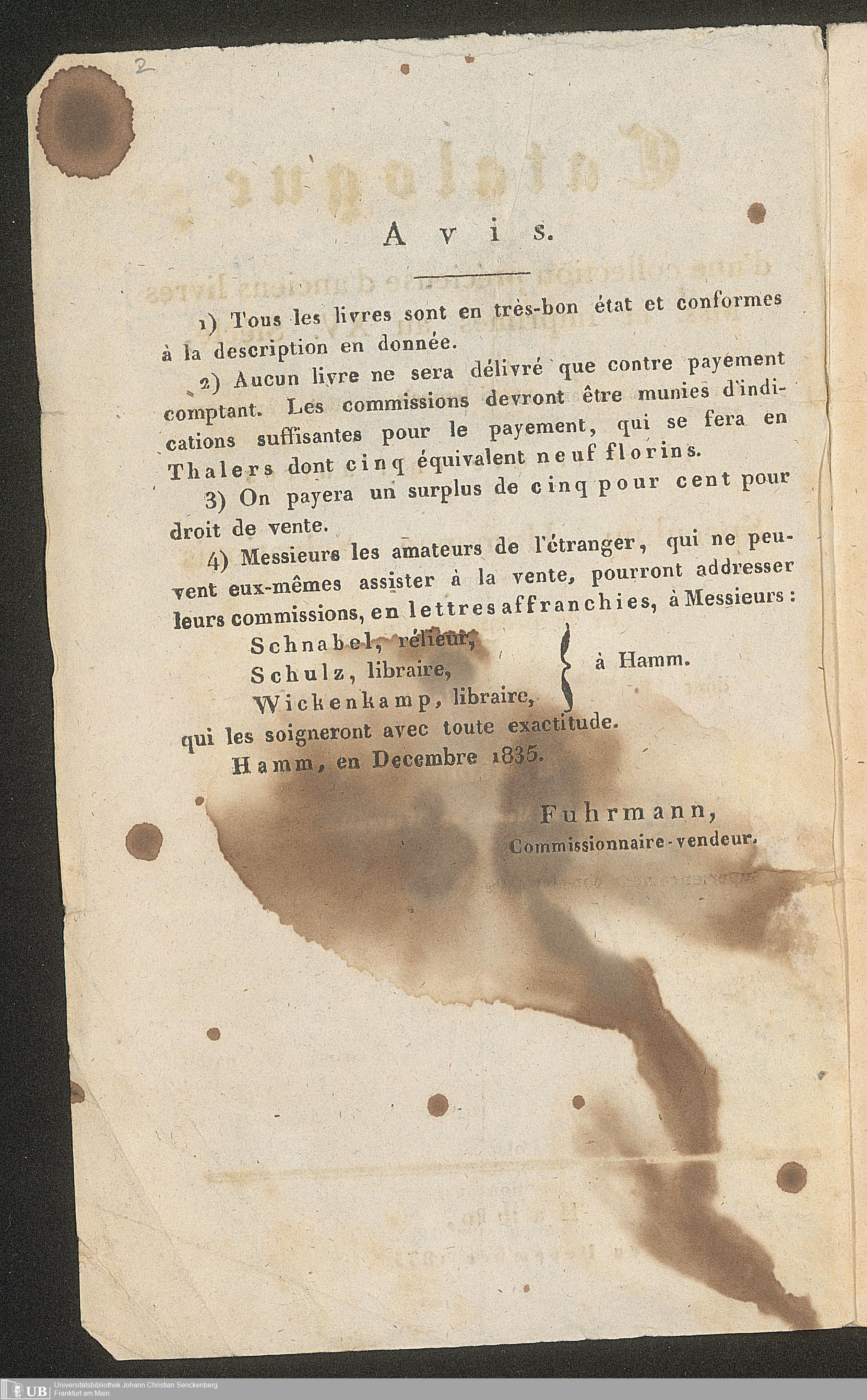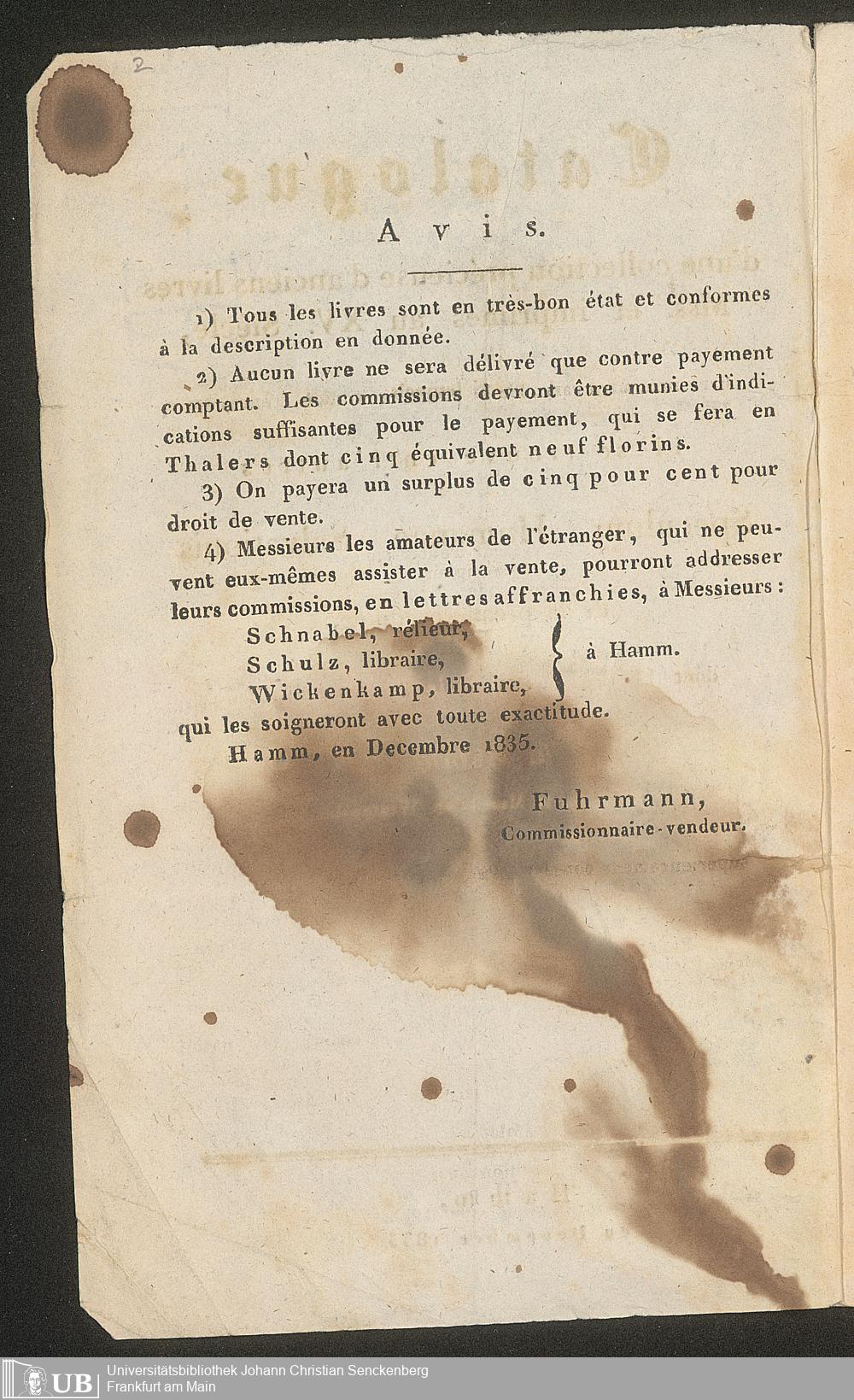 Ms. Ff. G. Kloß II.5.2.6 - Catalogue d'une collection précieuse d'anciens livres Mss. et imprimés au XV. Siècle, parmi lesquels il se trouve entr'autres Speculum Humanae Salvationis de la première édition, dont la vente se fera le 6 Fevrier 1836 à Hamm comté de la Marck en Westphalie