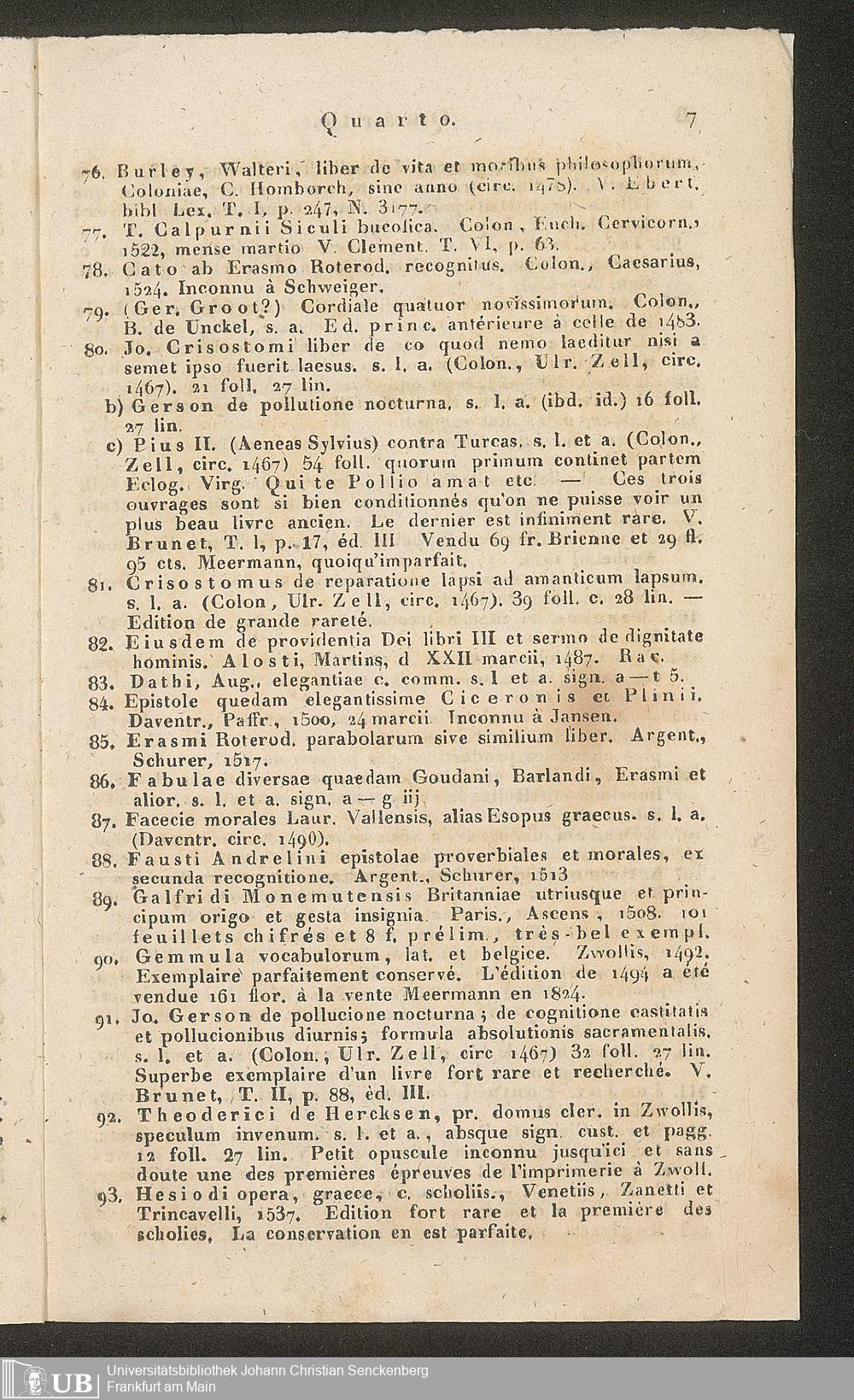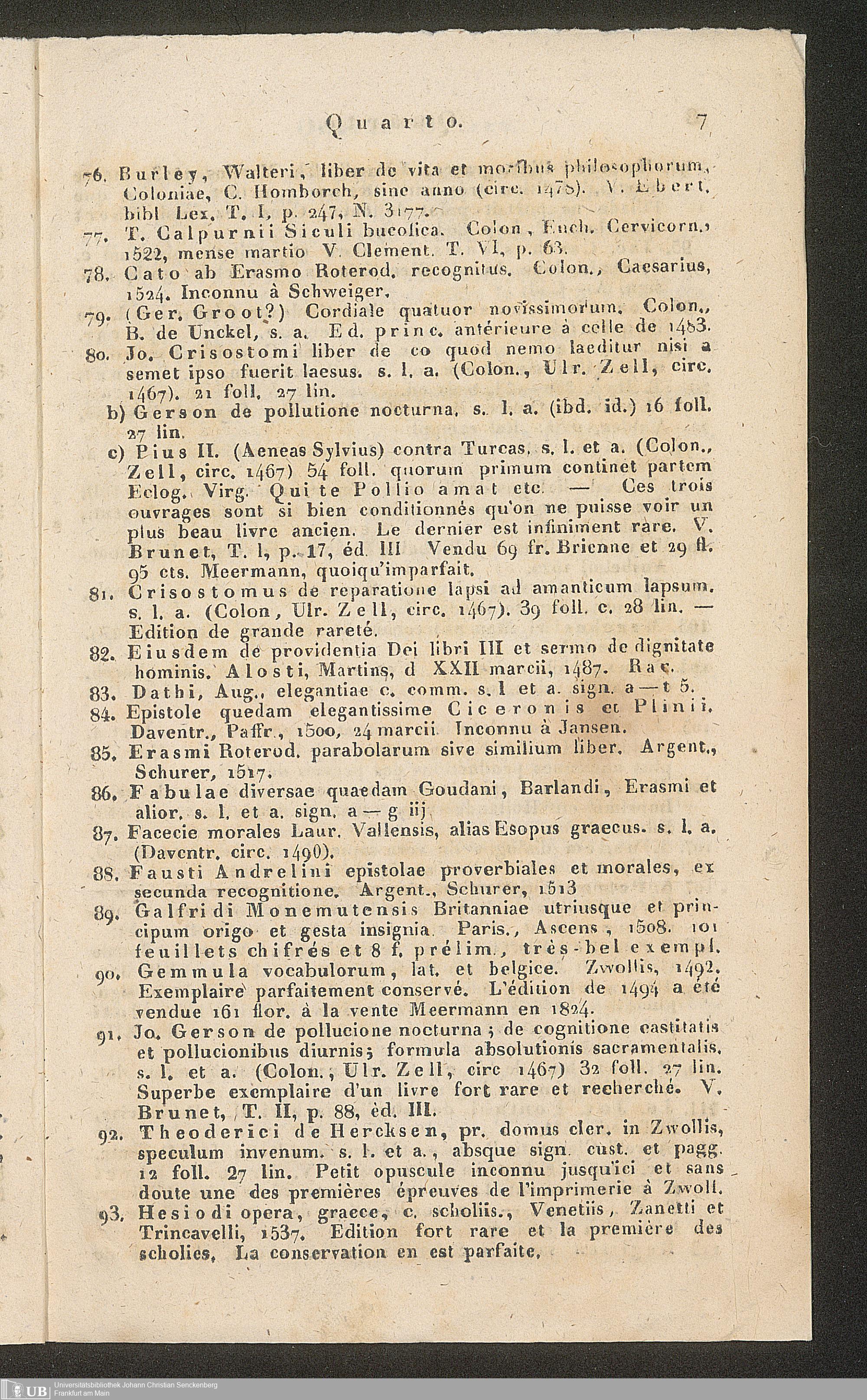 Ms. Ff. G. Kloß II.5.2.6 - Catalogue d'une collection précieuse d'anciens livres Mss. et imprimés au XV. Siècle, parmi lesquels il se trouve entr'autres Speculum Humanae Salvationis de la première édition, dont la vente se fera le 6 Fevrier 1836 à Hamm comté de la Marck en Westphalie