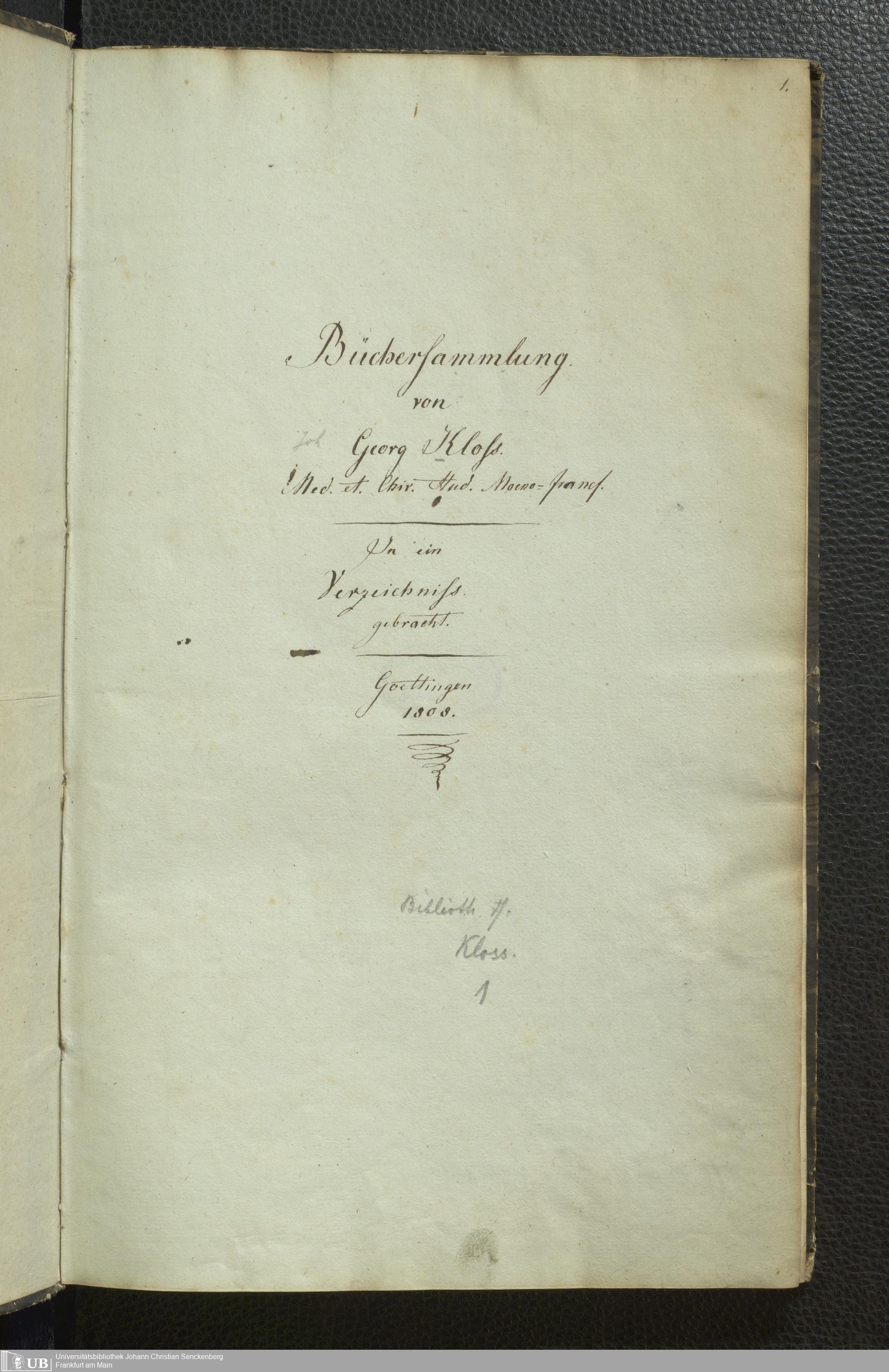 Ms. Ff. G. Kloß III.5 - Büchersammlung von Georg Kloss. Med. et. Chir. Stud. Moeno-Francf. In ein Verzeichniss gebracht.