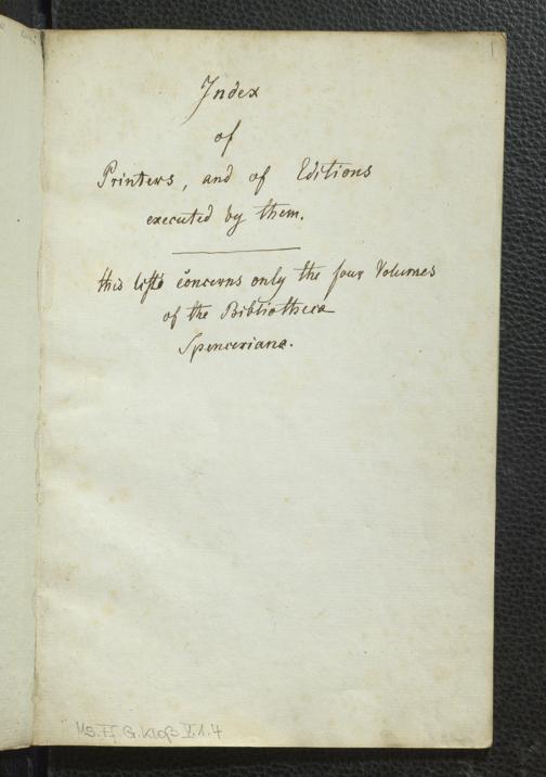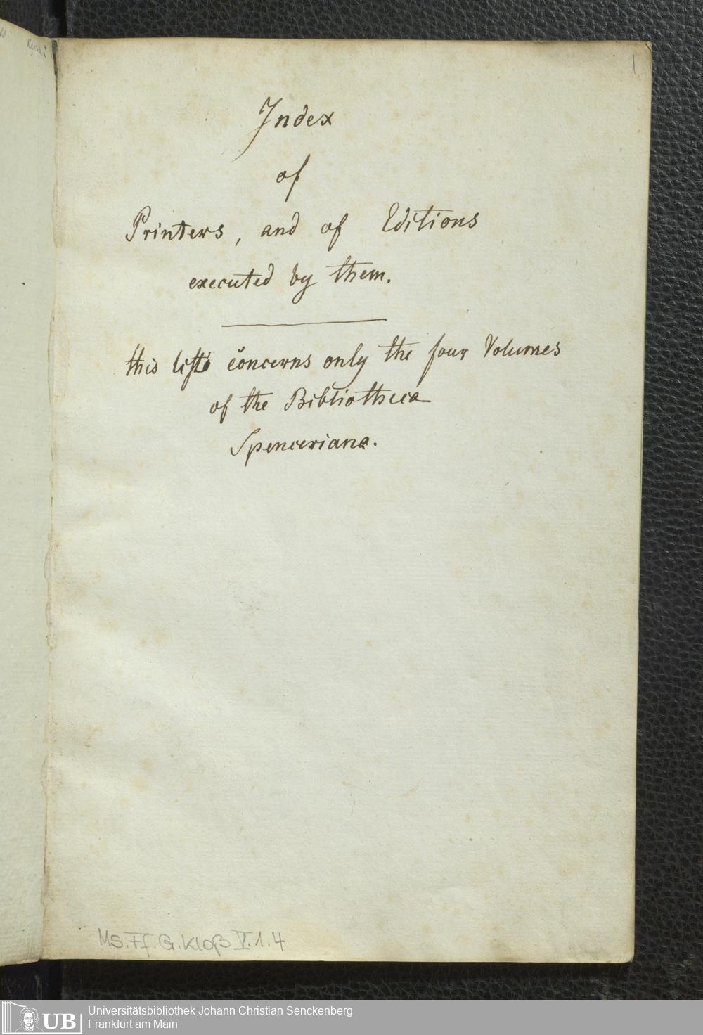 Ms. Ff. G. Kloß V.1.4 - Index of Printers, and of Editions executed by them. this list concerns only the four Volumes of the Bibliotheca Spenceriana.