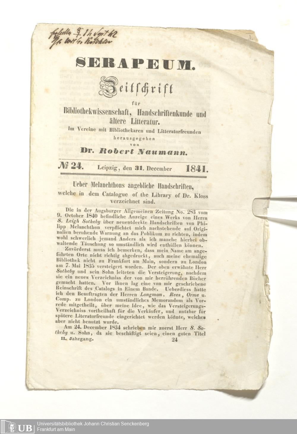 Ms. Ff. G. Kloß III.1 - Catalogus librorum palaeotyporum et manuscriptorum Georgii Klossii