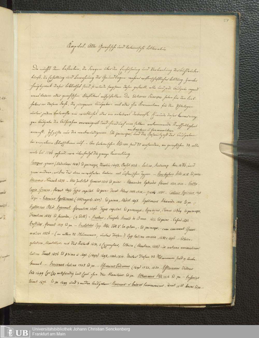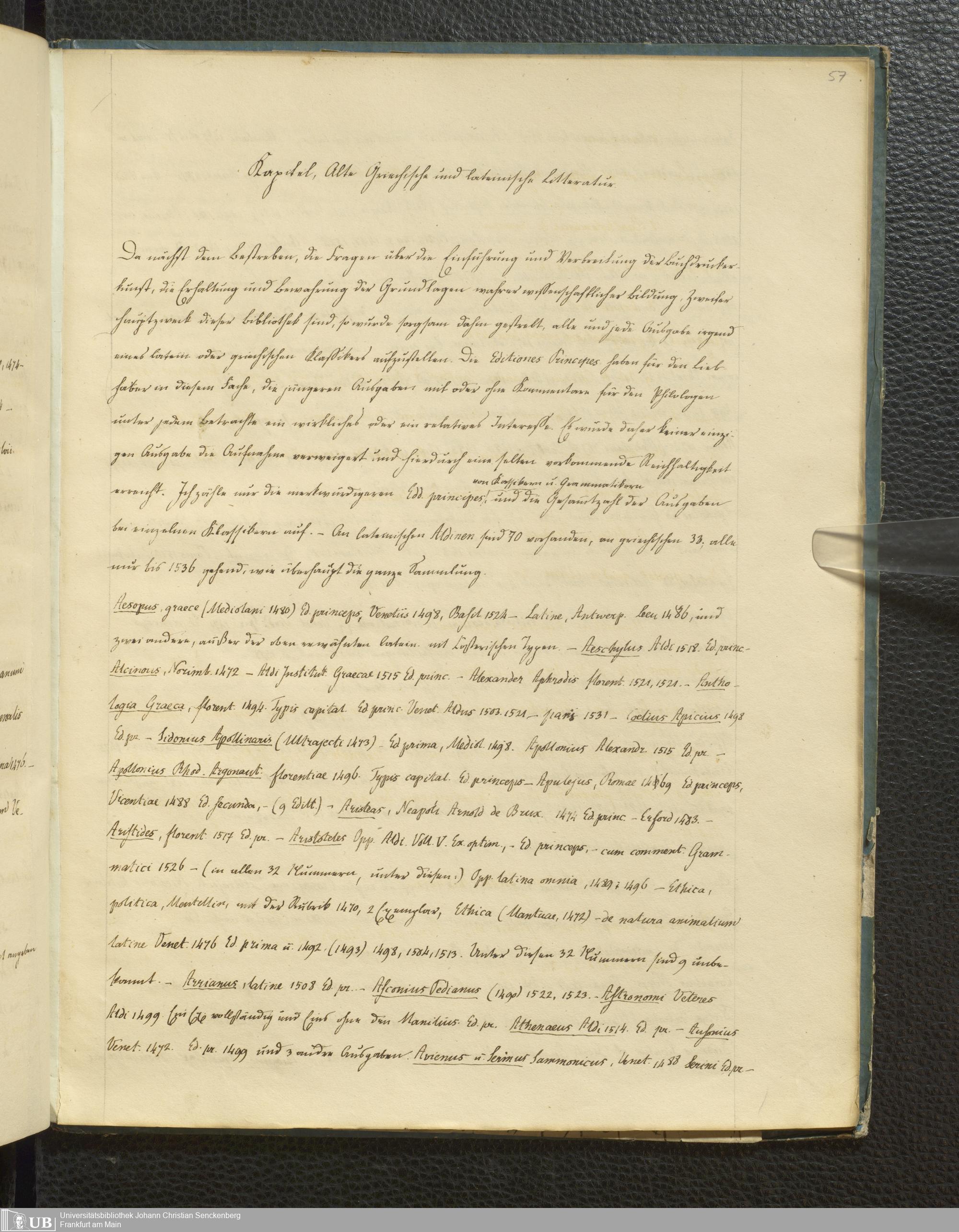 Ms. Ff. G. Kloß V.5 - Bibliotheca Palaeotyporum Georgii Kloss. M.D. Beschreibung und Plan der Sammlung 13 Julius 1834.