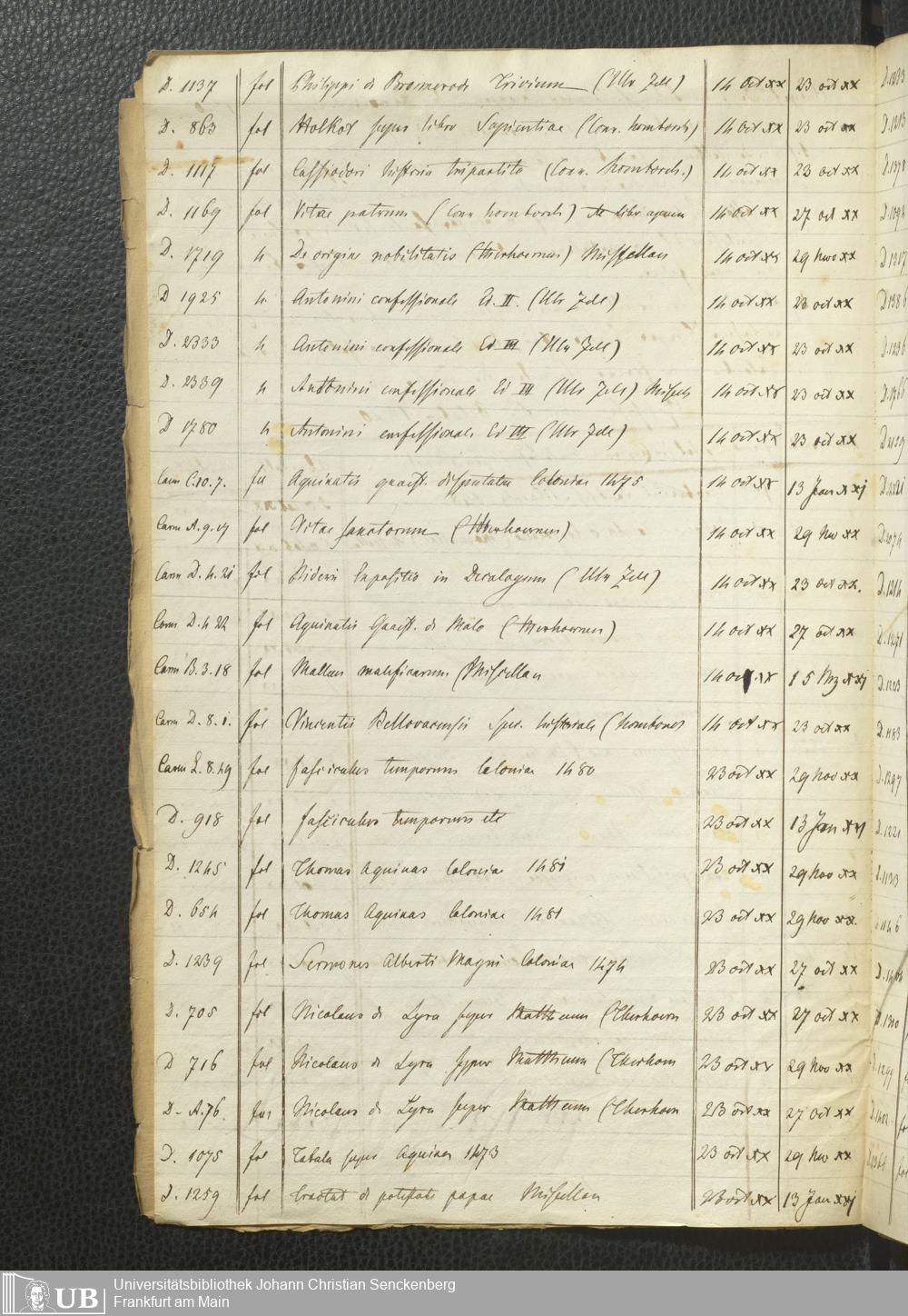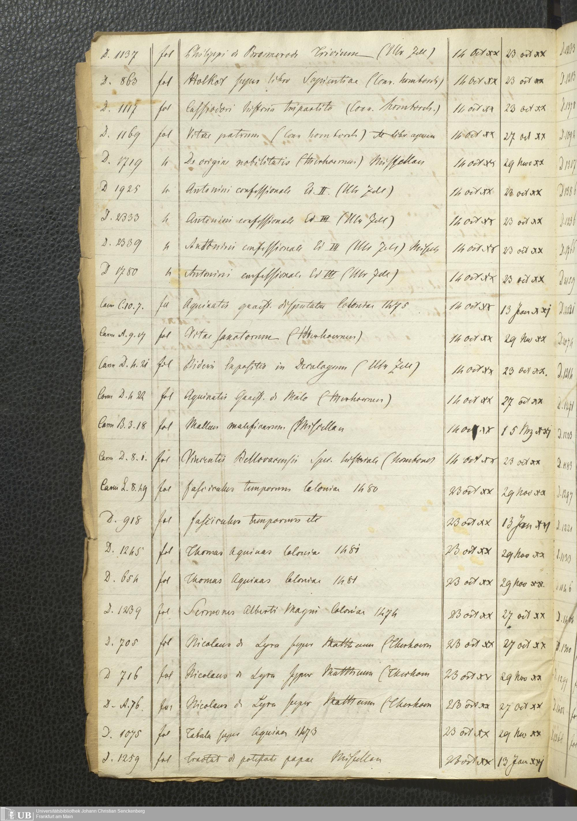 Ms. Ff. G. Kloß Nachlaßergänzung I.4 - Verzeichnis der entliehenen Bücher aus den Bibliotheken des Dominikaner- und des Karmeliterklosters in Frankfurt am Main