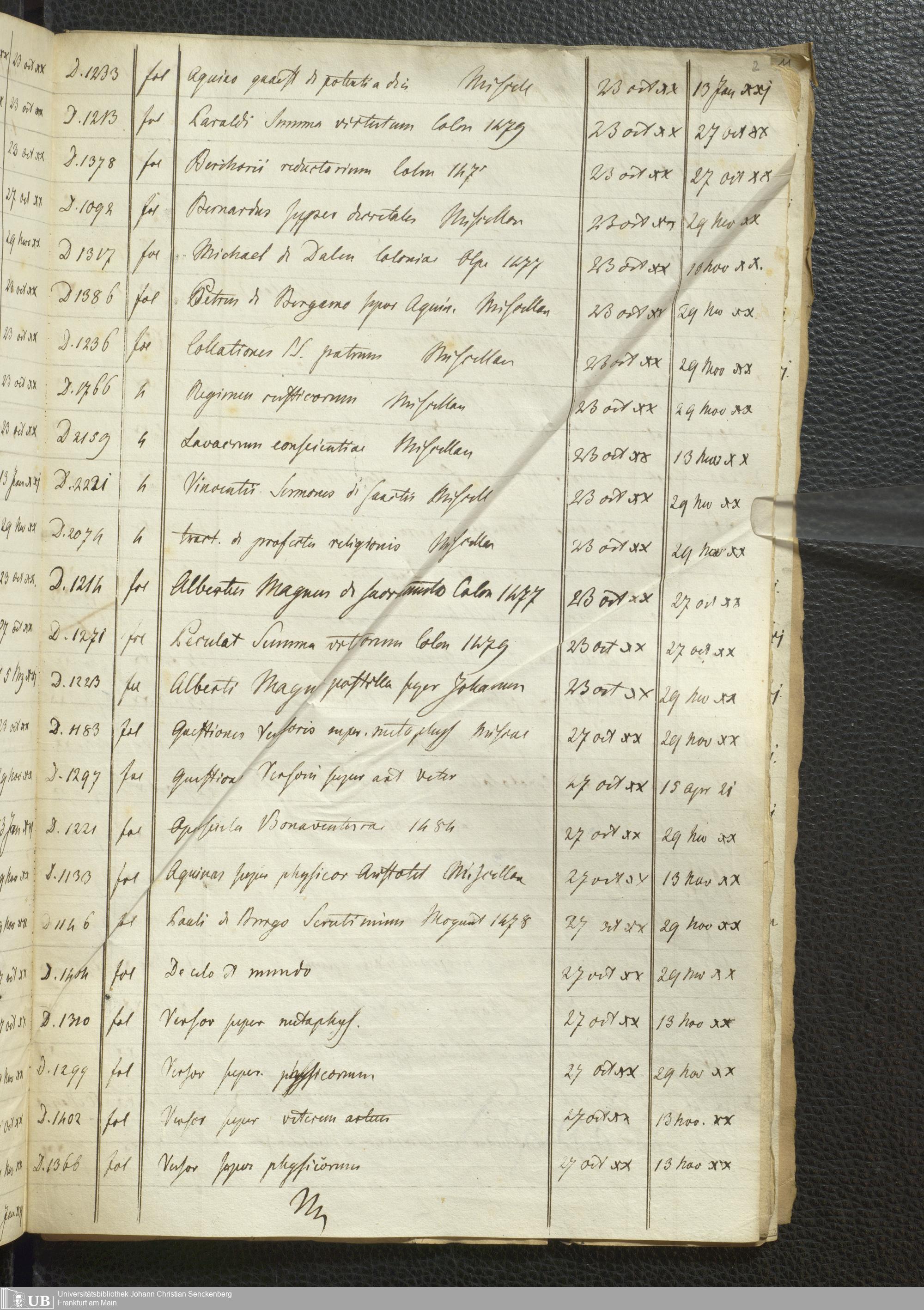 Ms. Ff. G. Kloß Nachlaßergänzung I.4 - Verzeichnis der entliehenen Bücher aus den Bibliotheken des Dominikaner- und des Karmeliterklosters in Frankfurt am Main