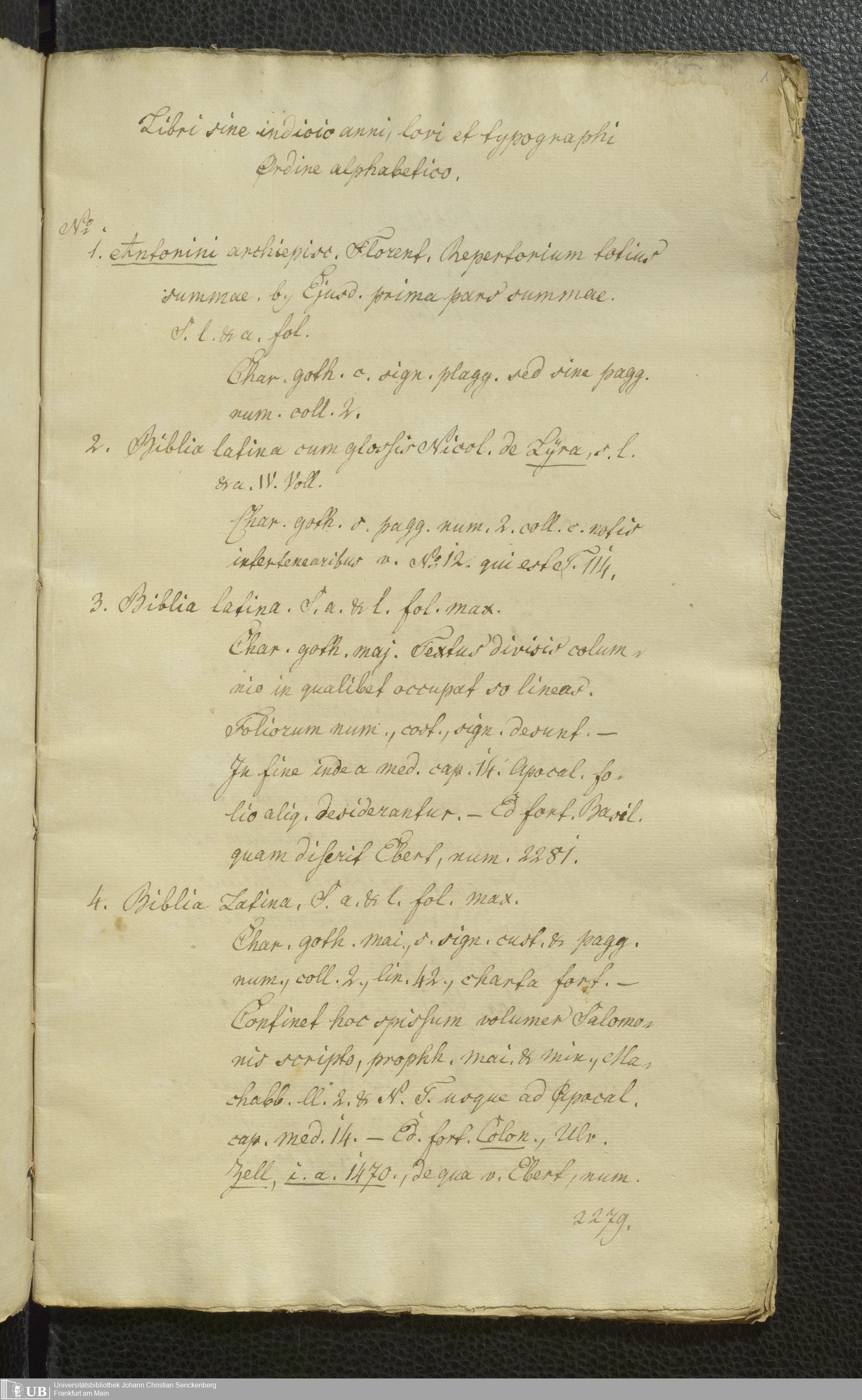 Ms. Ff. G. Kloß Nachlaßergänzung I.2 - Catalogus artis typographicae monumentorum quae in Bibliotheka Laubaco-Solmensi adservantur