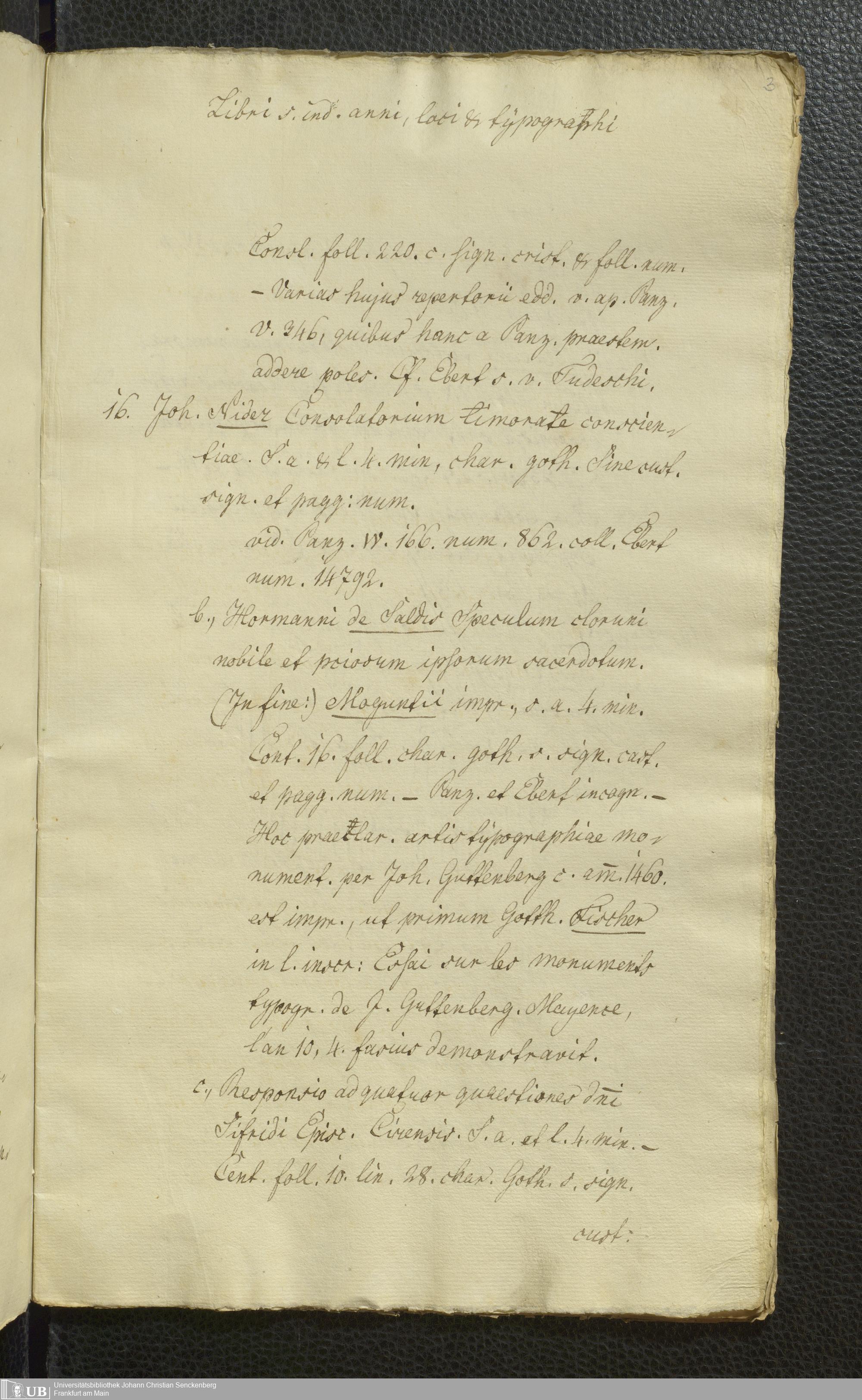 Ms. Ff. G. Kloß Nachlaßergänzung I.2 - Catalogus artis typographicae monumentorum quae in Bibliotheka Laubaco-Solmensi adservantur