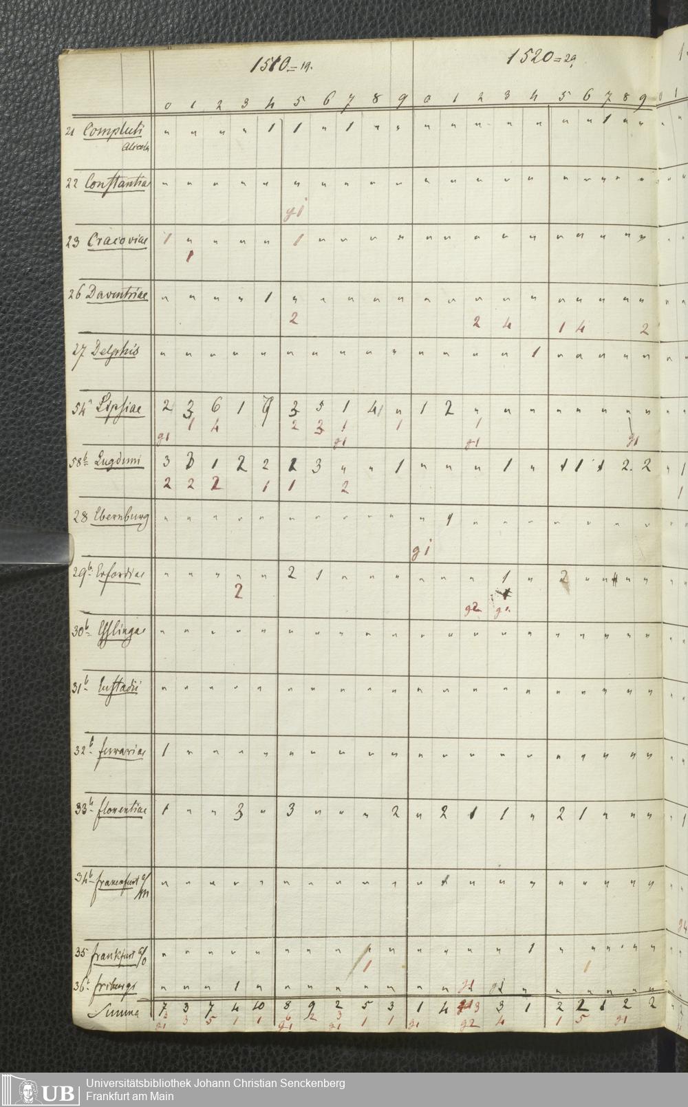 Ms. Ff. G. Kloß Nachlaßergänzung I.3 - Conspectus urbium et annorum quot in nostra collectione reperiuntur
