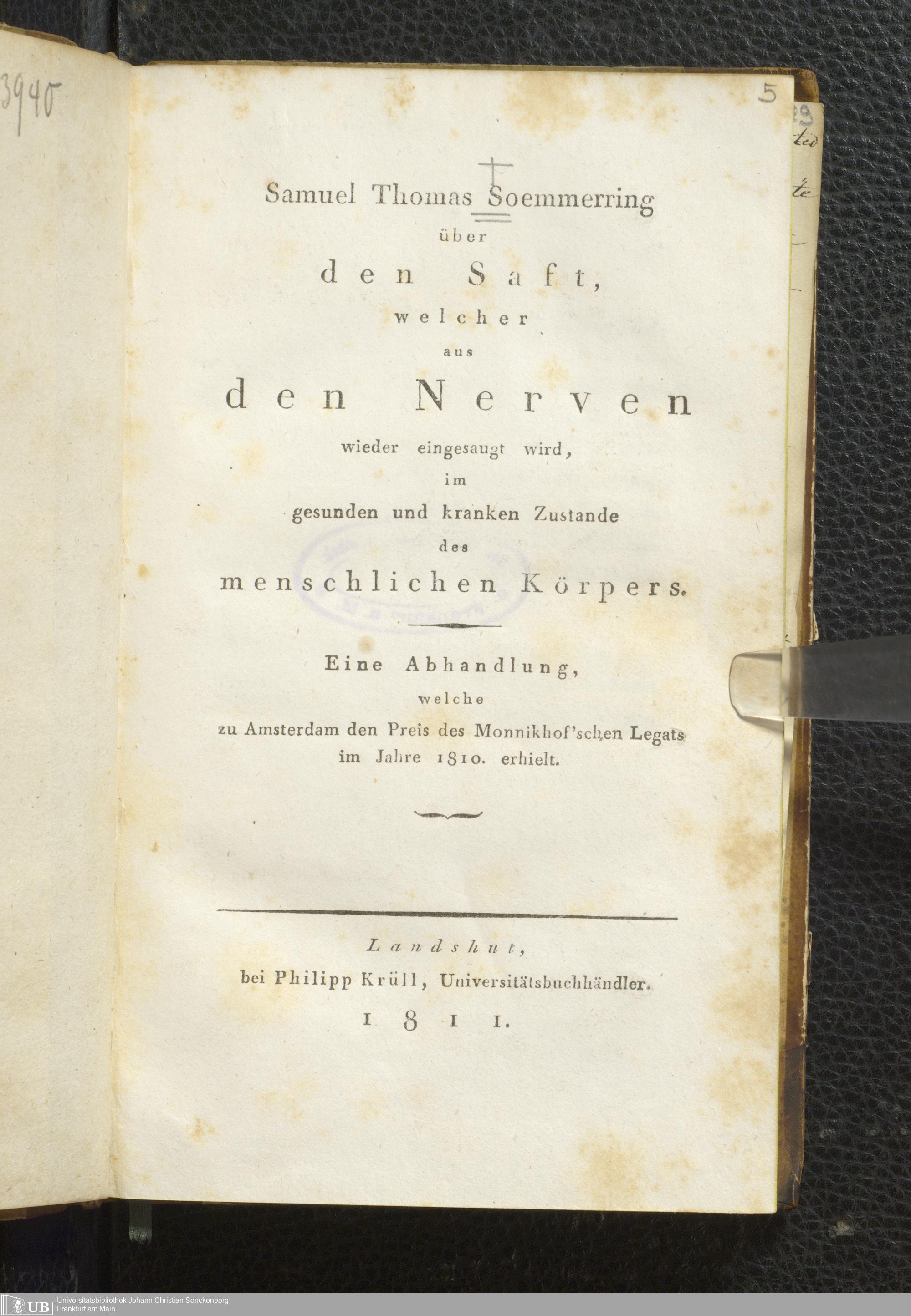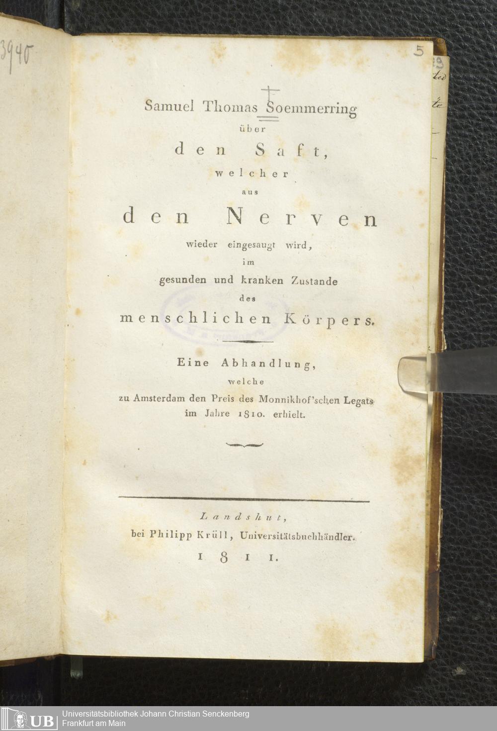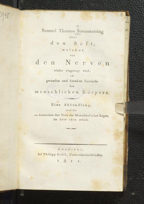 Soe 21 - Über den Saft, welcher aus den Nerven wieder eingesaugt wird, im gesunden und kranken Zustande des menschlichen Körpers. Eine Abhandlung, welche zu Amsterdam den Preis des Monnikhof'schen Legats im Jahre 1810 erhielt