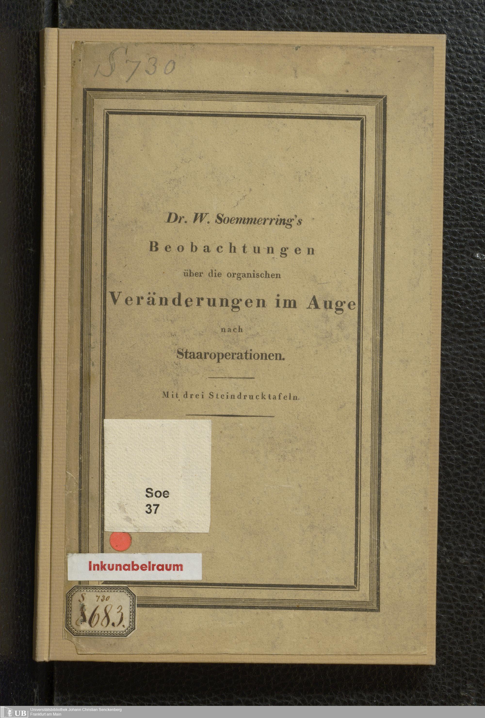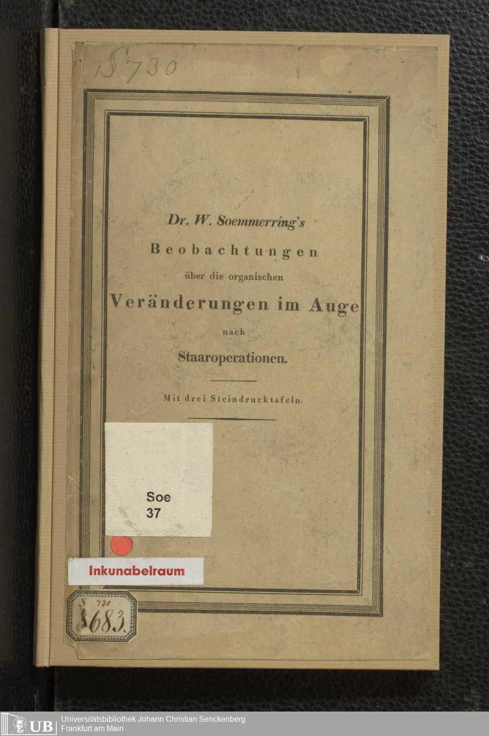 Soe 37 - Beobachtungen über die organischen Veränderungen im Auge nach Staaroperationen. Meinem hochverehrten und innigst geliebten Vater Samuel Thomas von Soemmerring am 7ten April 1828 dem festlichen Tage seines fünfzigjährigen Doctorjubiläums überreicht
