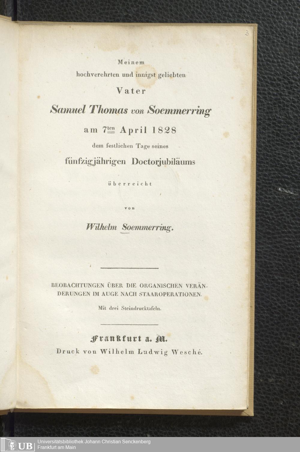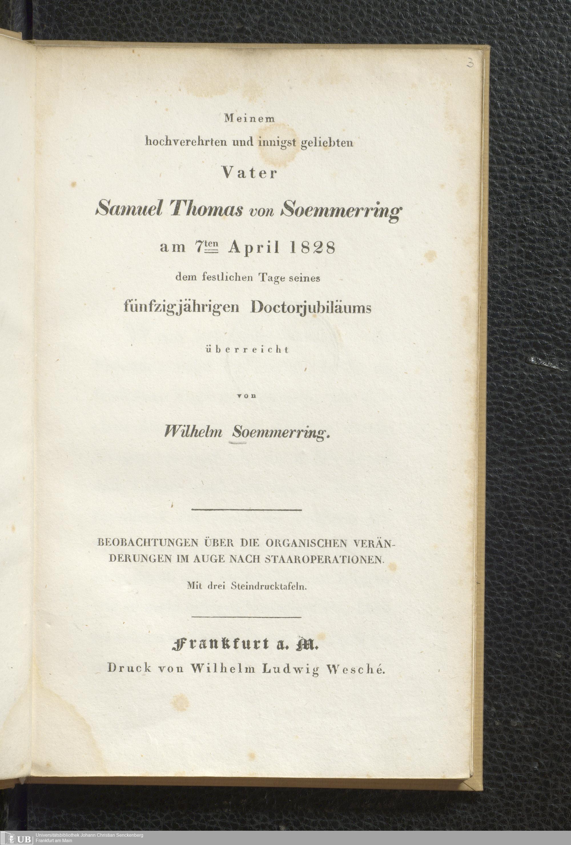 Soe 37 - Beobachtungen über die organischen Veränderungen im Auge nach Staaroperationen. Meinem hochverehrten und innigst geliebten Vater Samuel Thomas von Soemmerring am 7ten April 1828 dem festlichen Tage seines fünfzigjährigen Doctorjubiläums überreicht