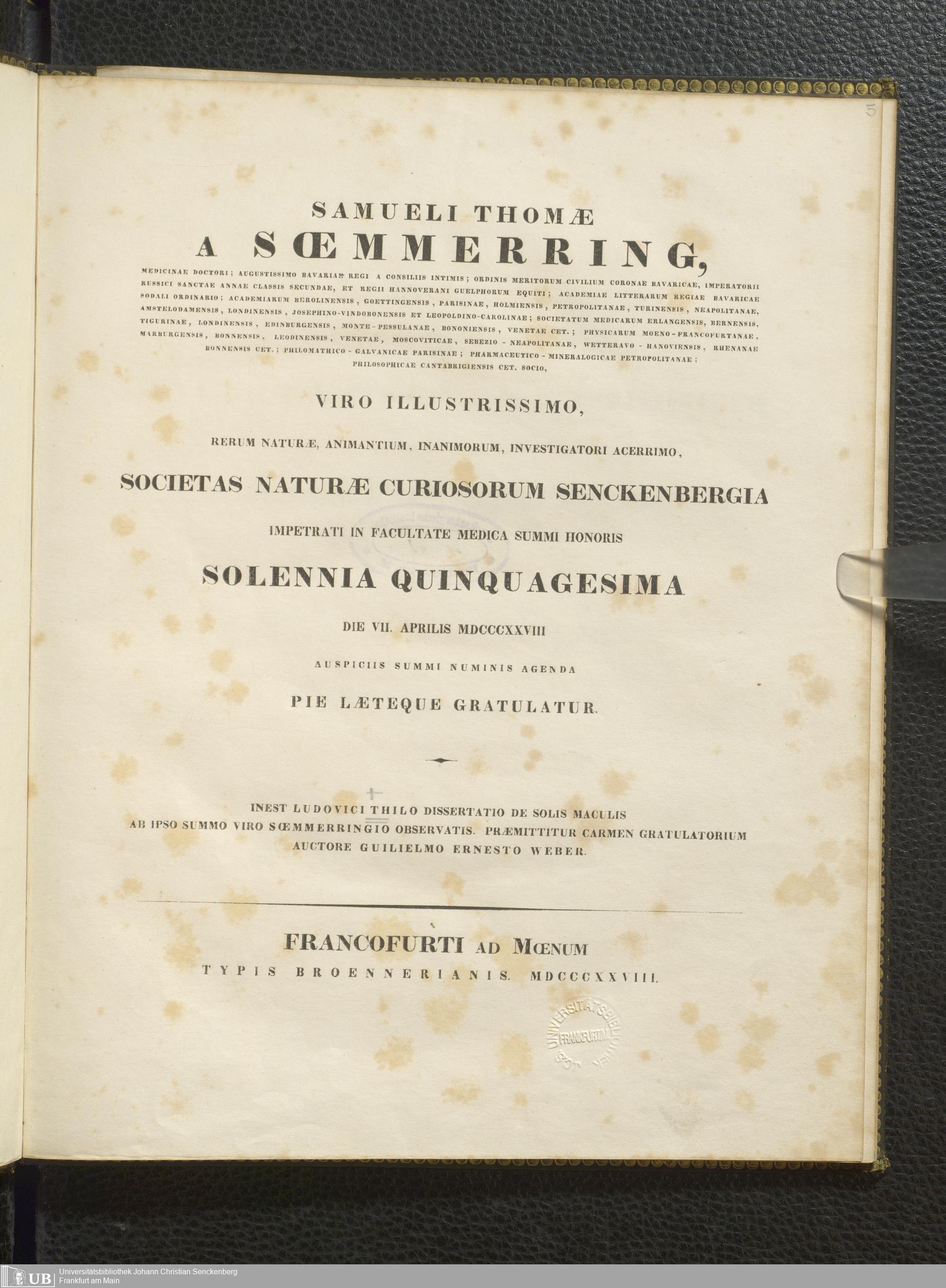 Soe 39 - Dissertatio de solis maculis ab ipso summo viro Soemmerringio observatis. Praemittitur carmen gratulatorium