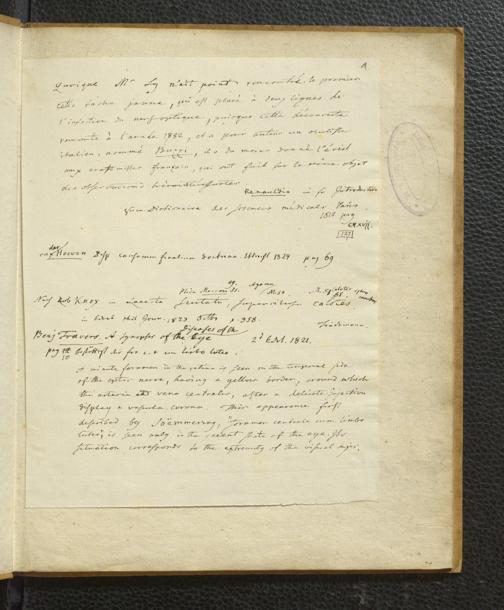 Soe 48 - Foramen centrale. Handexemplar von: Il Discorso del Dottore Felice Santis, Professore di medicina nella Università, Sull’uso, ed officio del Punto scoperto da Soemering nel fondo dell’occhio umano. Perugia, 1816. Mit umfangreichen Notizen/Exzerpten Soemmerrings.