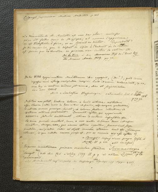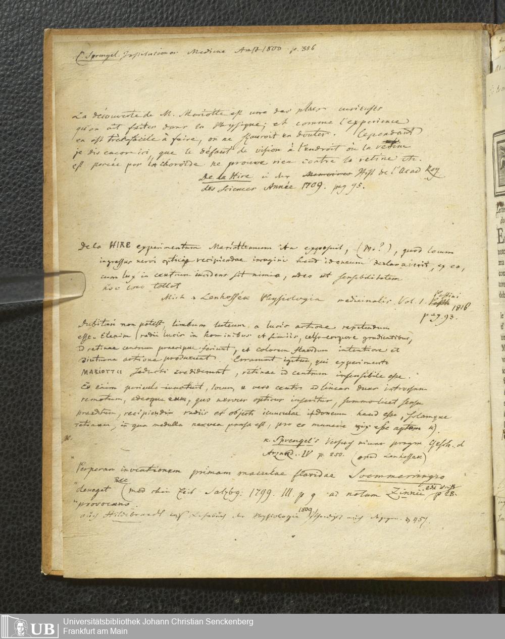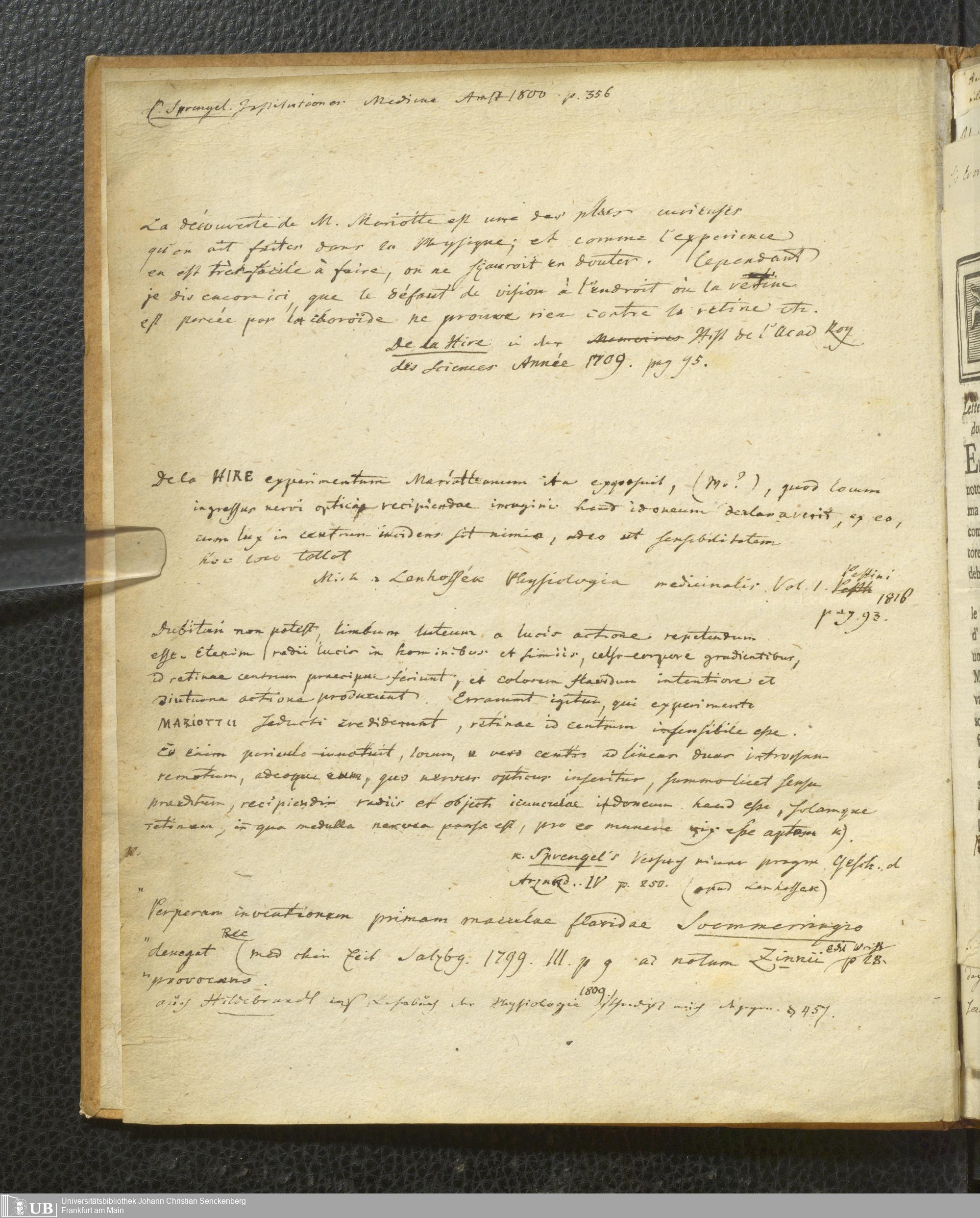 Soe 48 - Foramen centrale. Handexemplar von: Il Discorso del Dottore Felice Santis, Professore di medicina nella Università, Sull’uso, ed officio del Punto scoperto da Soemering nel fondo dell’occhio umano. Perugia, 1816. Mit umfangreichen Notizen/Exzerpten Soemmerrings.