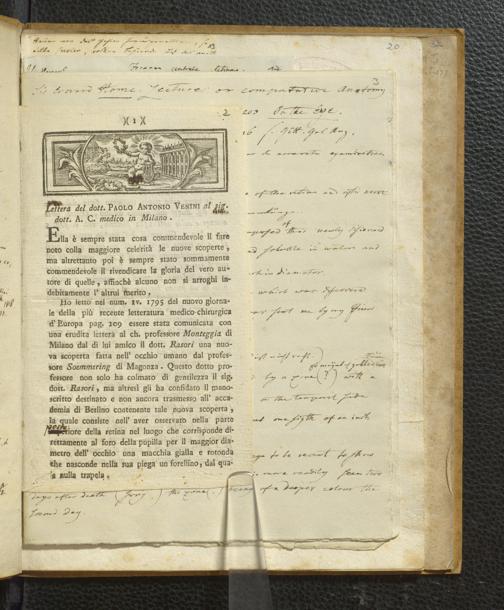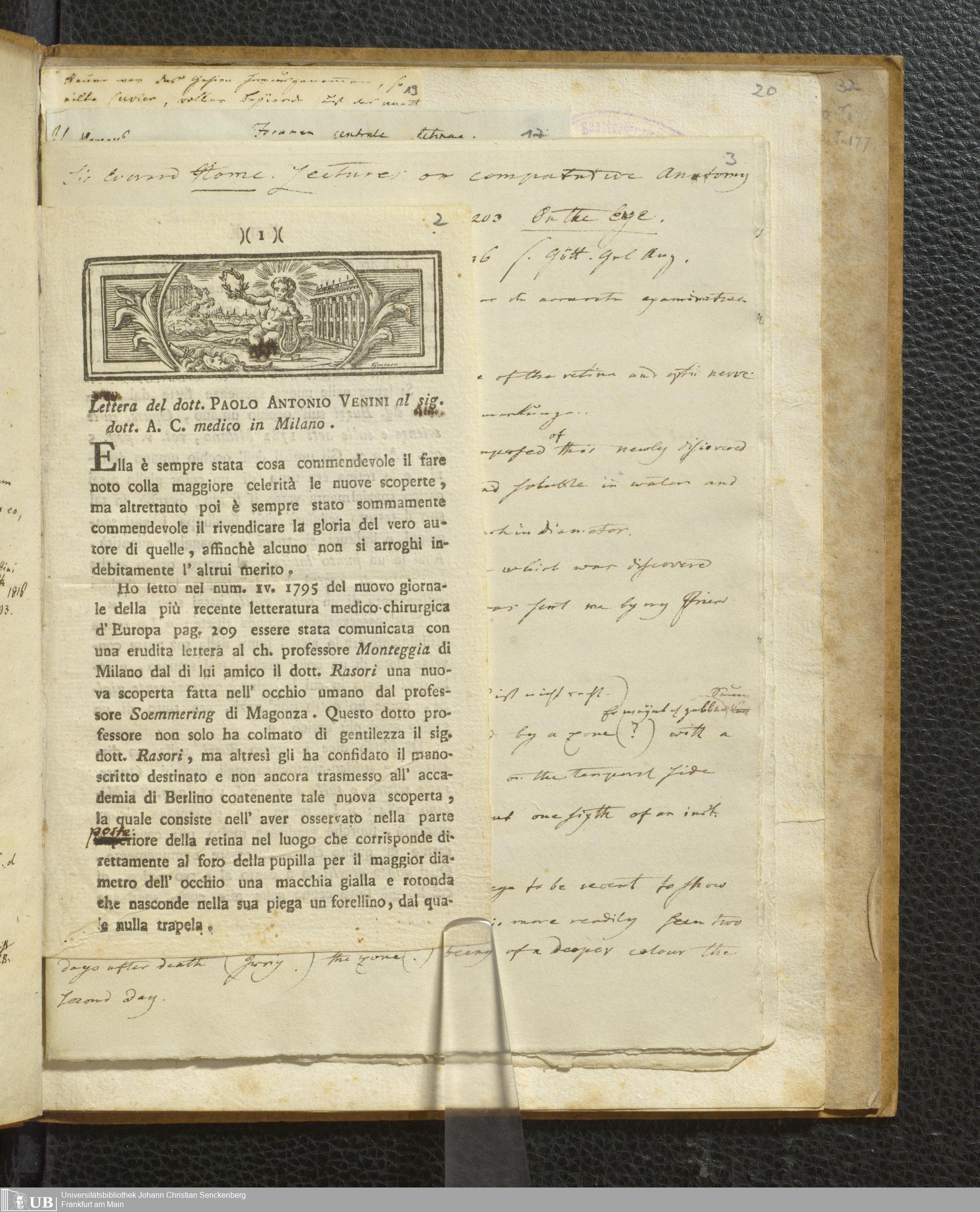 Soe 48 - Foramen centrale. Handexemplar von: Il Discorso del Dottore Felice Santis, Professore di medicina nella Università, Sull’uso, ed officio del Punto scoperto da Soemering nel fondo dell’occhio umano. Perugia, 1816. Mit umfangreichen Notizen/Exzerpten Soemmerrings.