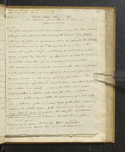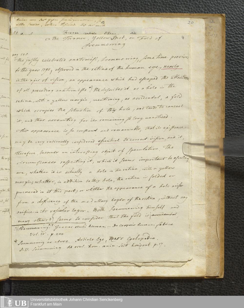 Soe 48 - Foramen centrale. Handexemplar von: Il Discorso del Dottore Felice Santis, Professore di medicina nella Università, Sull’uso, ed officio del Punto scoperto da Soemering nel fondo dell’occhio umano. Perugia, 1816. Mit umfangreichen Notizen/Exzerpten Soemmerrings.