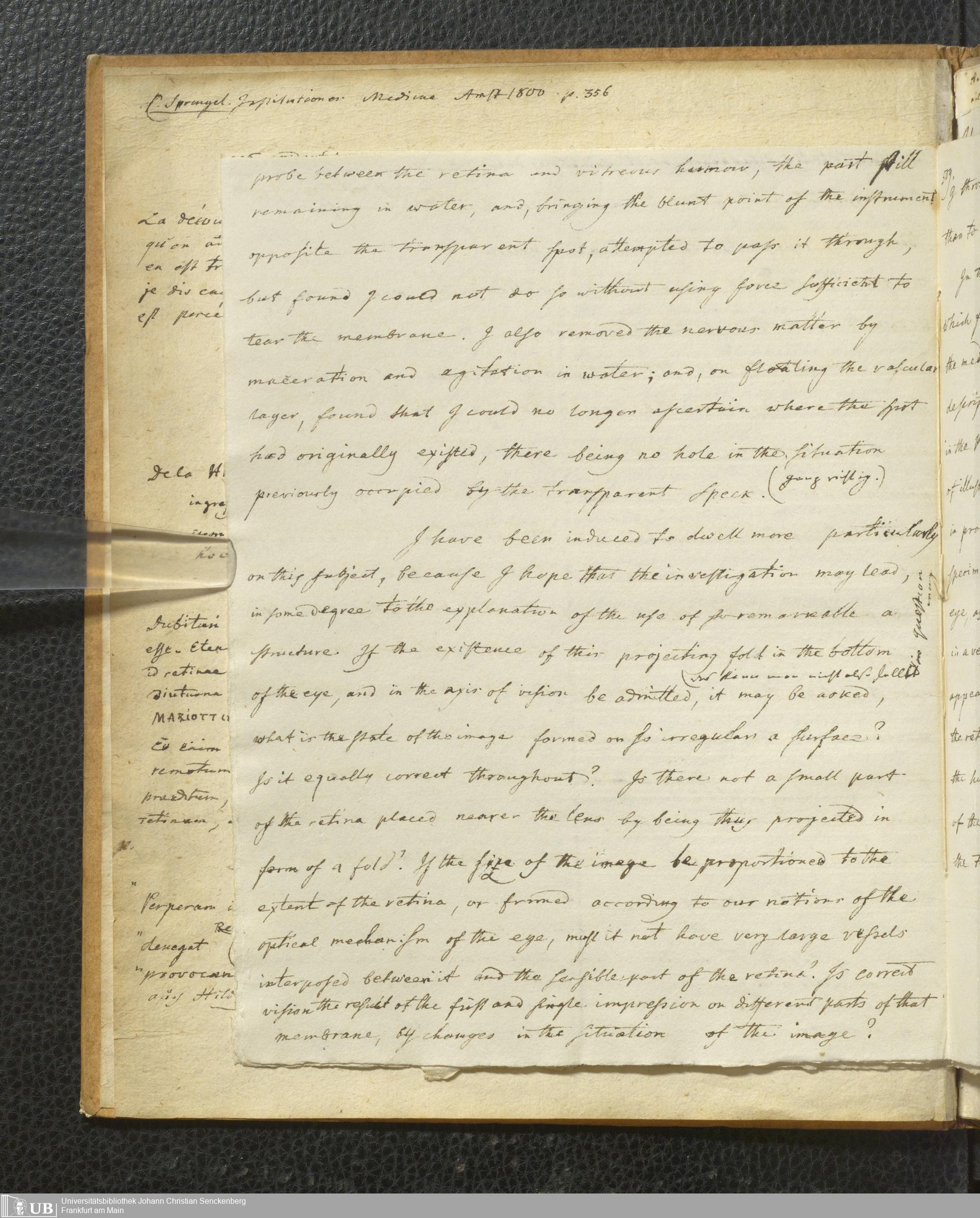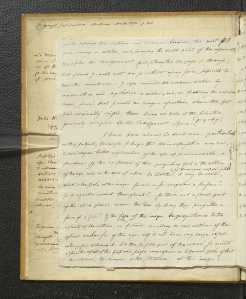 Soe 48 - Foramen centrale. Handexemplar von: Il Discorso del Dottore Felice Santis, Professore di medicina nella Università, Sull’uso, ed officio del Punto scoperto da Soemering nel fondo dell’occhio umano. Perugia, 1816. Mit umfangreichen Notizen/Exzerpten Soemmerrings.