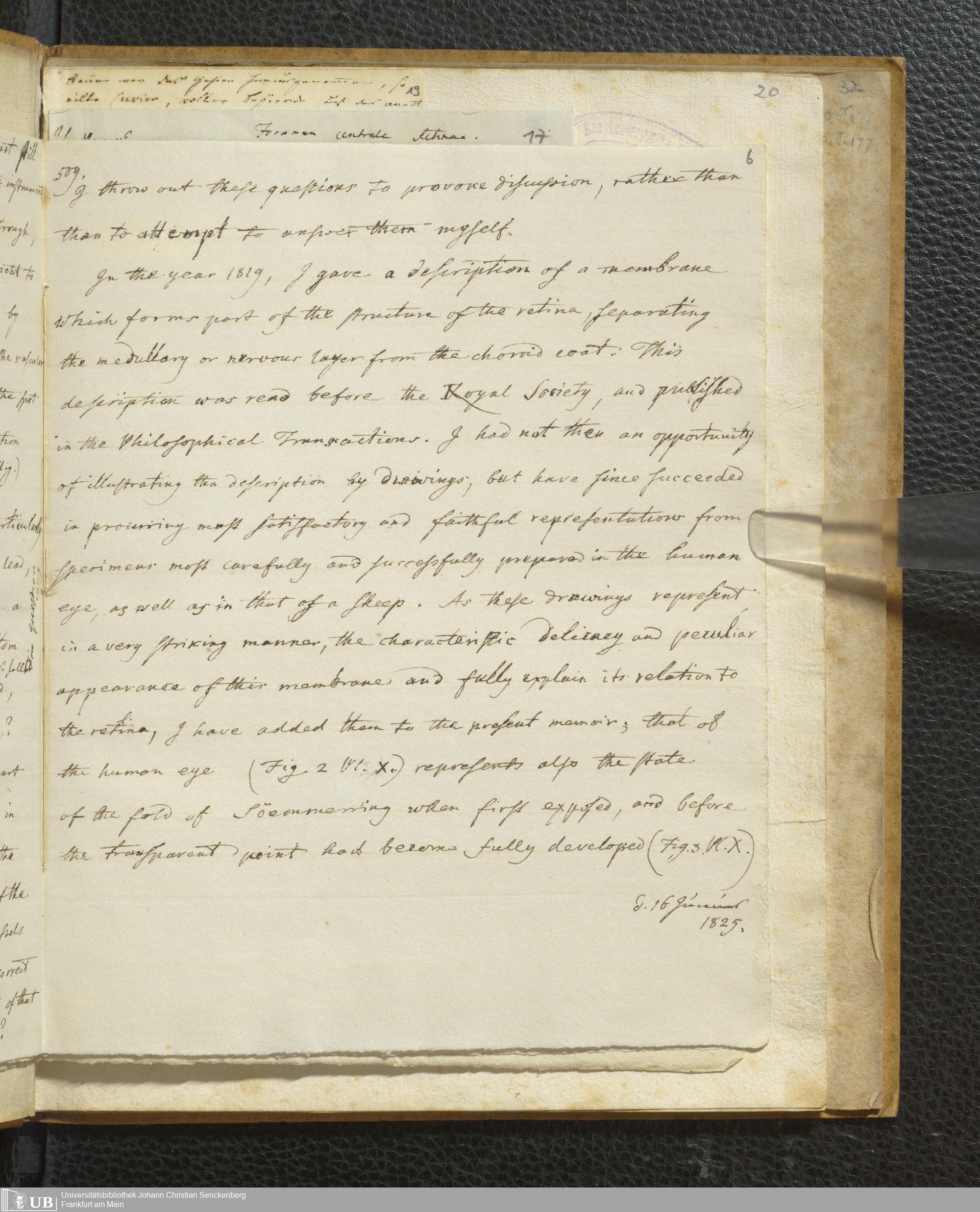Soe 48 - Foramen centrale. Handexemplar von: Il Discorso del Dottore Felice Santis, Professore di medicina nella Università, Sull’uso, ed officio del Punto scoperto da Soemering nel fondo dell’occhio umano. Perugia, 1816. Mit umfangreichen Notizen/Exzerpten Soemmerrings.