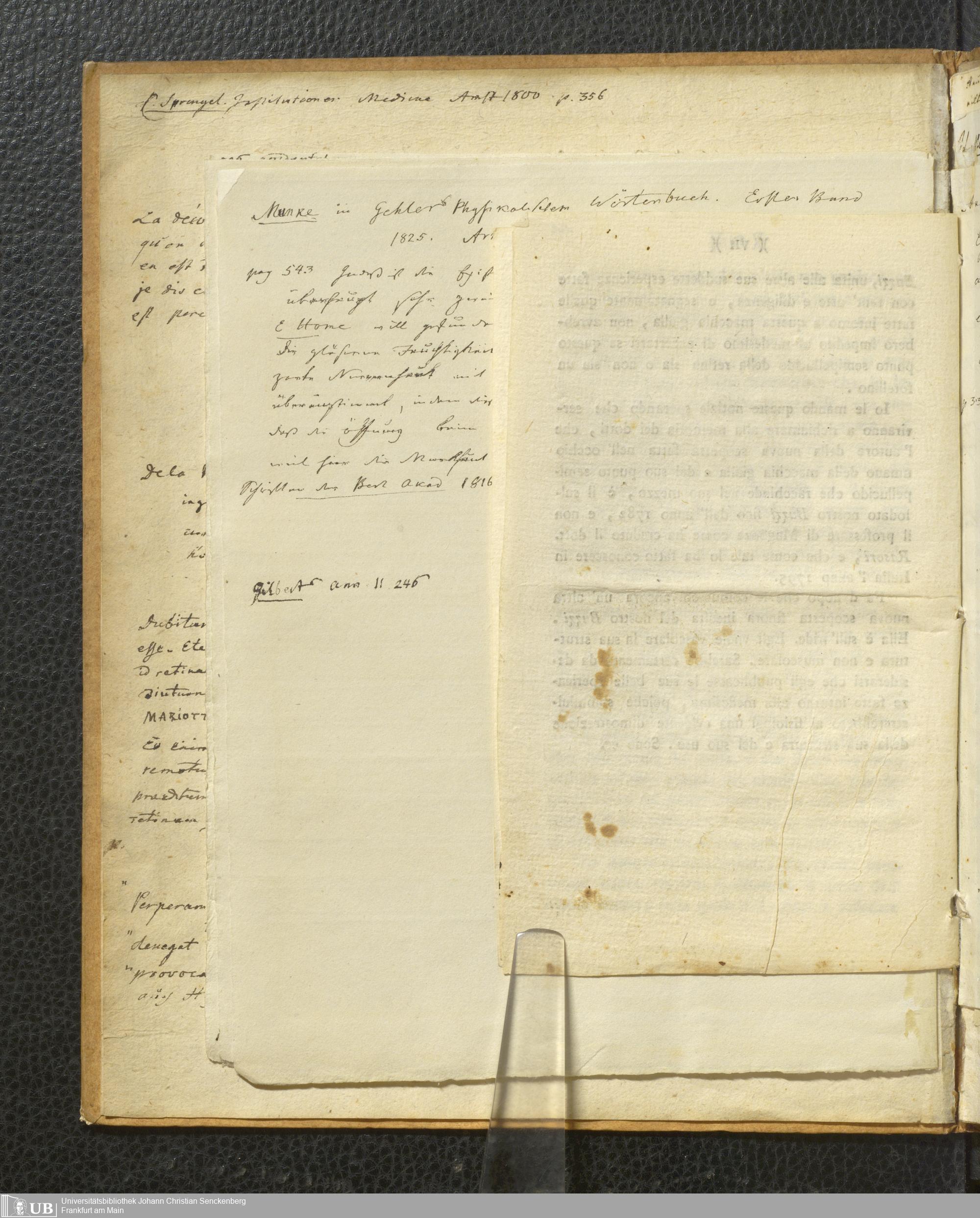 Soe 48 - Foramen centrale. Handexemplar von: Il Discorso del Dottore Felice Santis, Professore di medicina nella Università, Sull’uso, ed officio del Punto scoperto da Soemering nel fondo dell’occhio umano. Perugia, 1816. Mit umfangreichen Notizen/Exzerpten Soemmerrings.