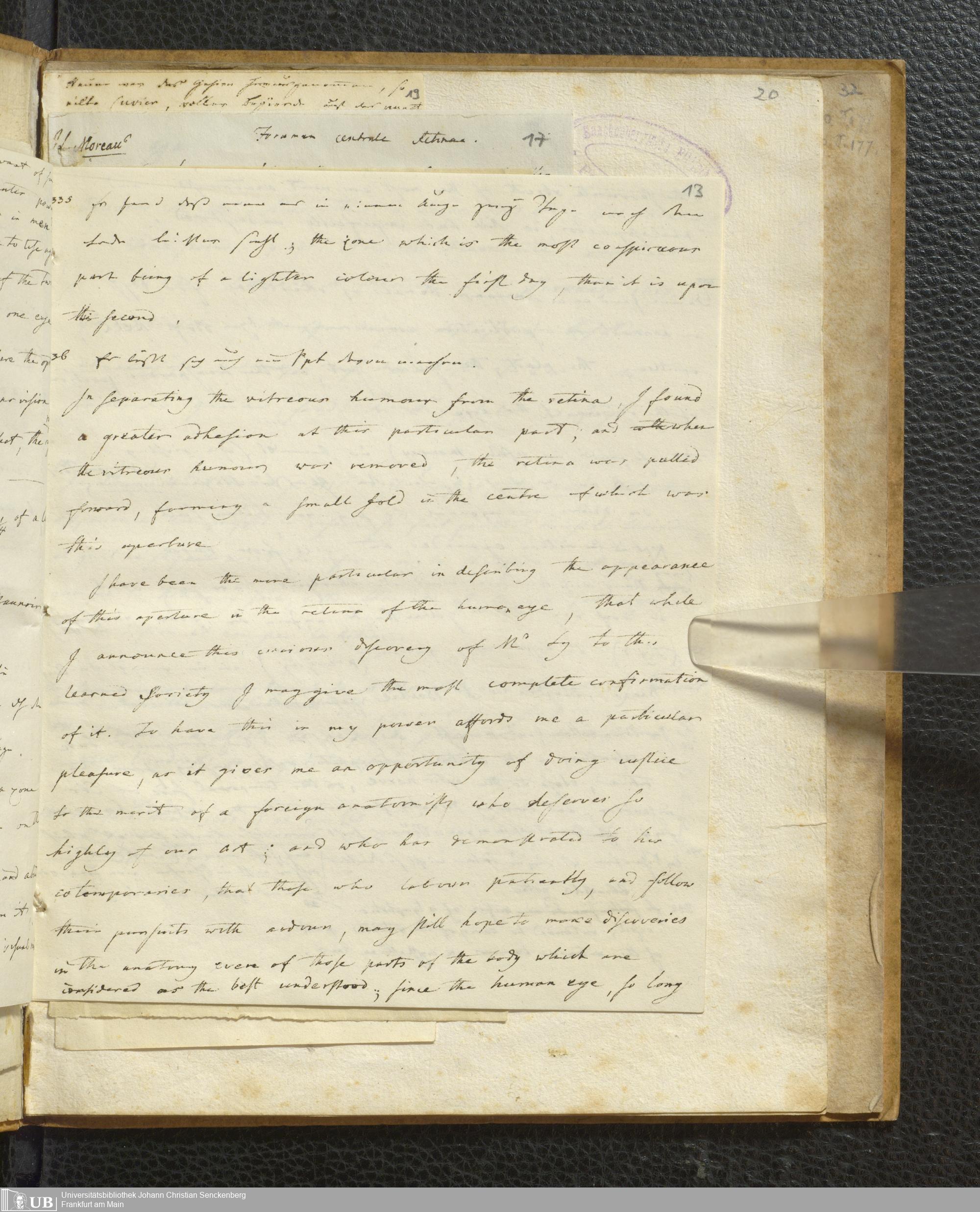 Soe 48 - Foramen centrale. Handexemplar von: Il Discorso del Dottore Felice Santis, Professore di medicina nella Università, Sull’uso, ed officio del Punto scoperto da Soemering nel fondo dell’occhio umano. Perugia, 1816. Mit umfangreichen Notizen/Exzerpten Soemmerrings.