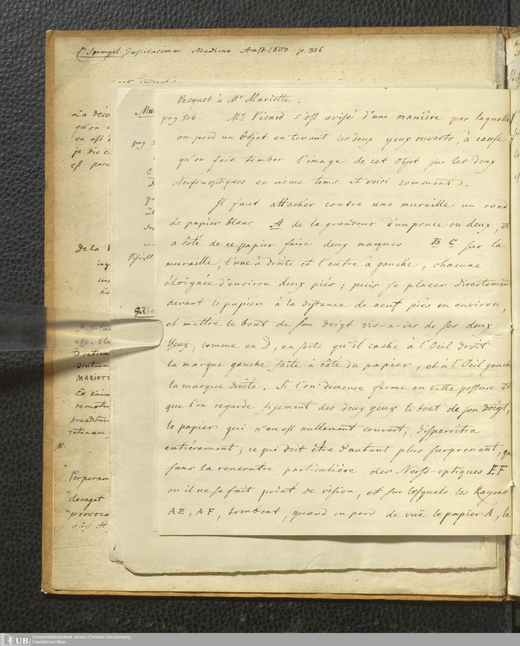 Soe 48 - Foramen centrale. Handexemplar von: Il Discorso del Dottore Felice Santis, Professore di medicina nella Università, Sull’uso, ed officio del Punto scoperto da Soemering nel fondo dell’occhio umano. Perugia, 1816. Mit umfangreichen Notizen/Exzerpten Soemmerrings.