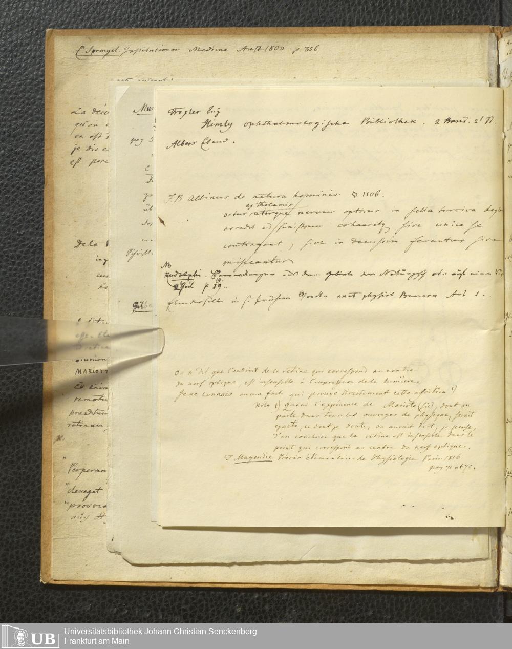 Soe 48 - Foramen centrale. Handexemplar von: Il Discorso del Dottore Felice Santis, Professore di medicina nella Università, Sull’uso, ed officio del Punto scoperto da Soemering nel fondo dell’occhio umano. Perugia, 1816. Mit umfangreichen Notizen/Exzerpten Soemmerrings.