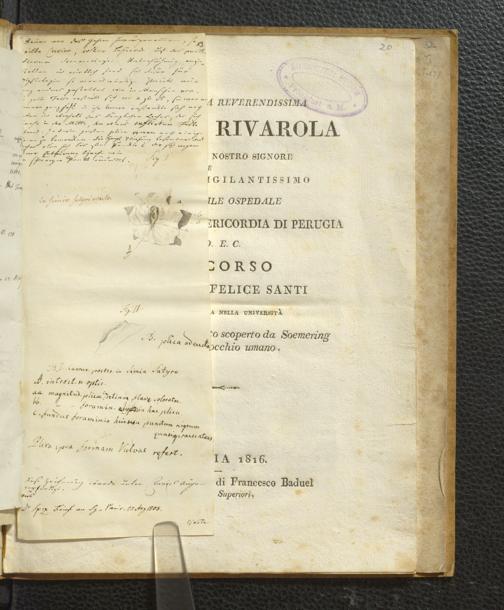 Soe 48 - Foramen centrale. Handexemplar von: Il Discorso del Dottore Felice Santis, Professore di medicina nella Università, Sull’uso, ed officio del Punto scoperto da Soemering nel fondo dell’occhio umano. Perugia, 1816. Mit umfangreichen Notizen/Exzerpten Soemmerrings.