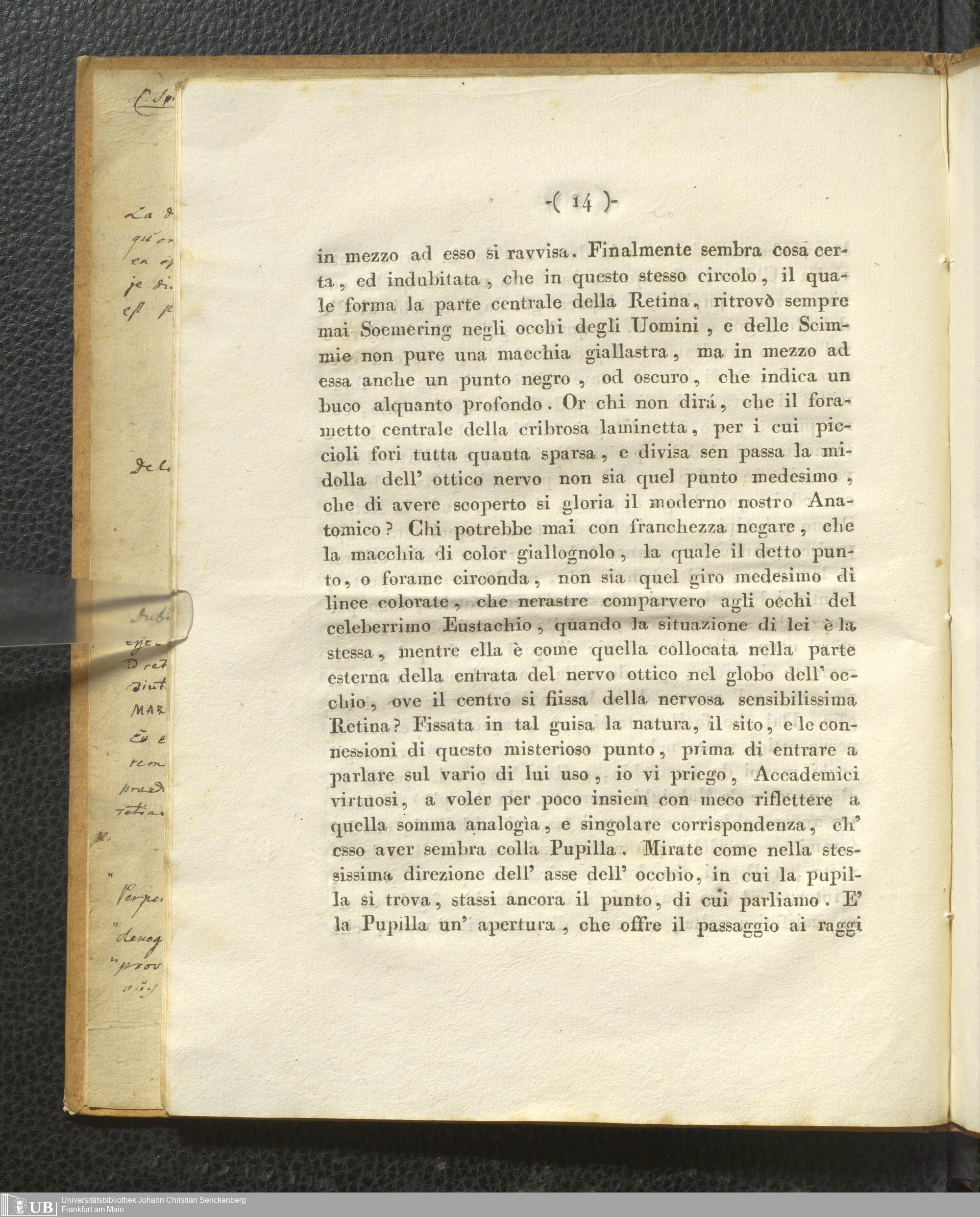 Soe 48 - Foramen centrale. Handexemplar von: Il Discorso del Dottore Felice Santis, Professore di medicina nella Università, Sull’uso, ed officio del Punto scoperto da Soemering nel fondo dell’occhio umano. Perugia, 1816. Mit umfangreichen Notizen/Exzerpten Soemmerrings.