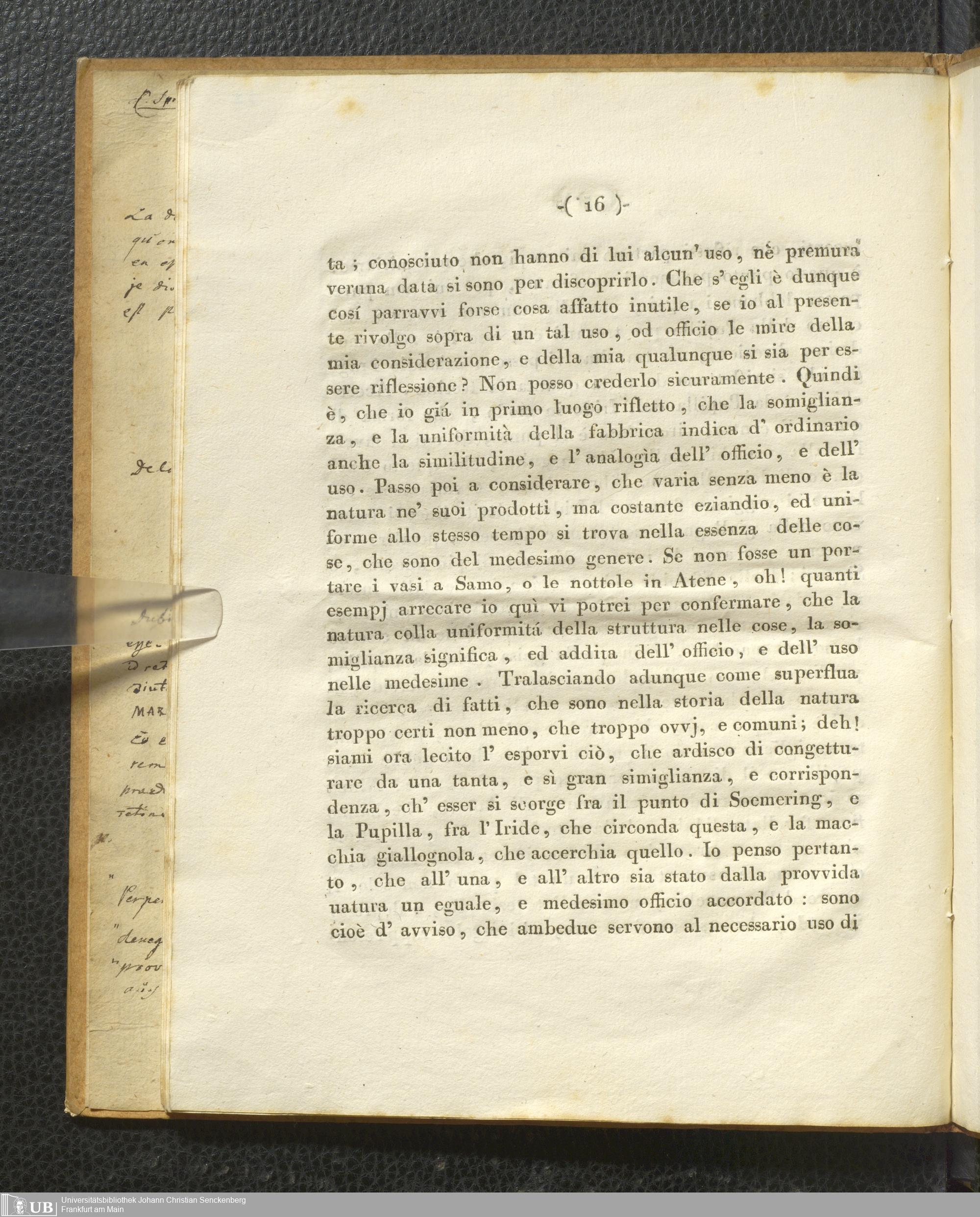 Soe 48 - Foramen centrale. Handexemplar von: Il Discorso del Dottore Felice Santis, Professore di medicina nella Università, Sull’uso, ed officio del Punto scoperto da Soemering nel fondo dell’occhio umano. Perugia, 1816. Mit umfangreichen Notizen/Exzerpten Soemmerrings.