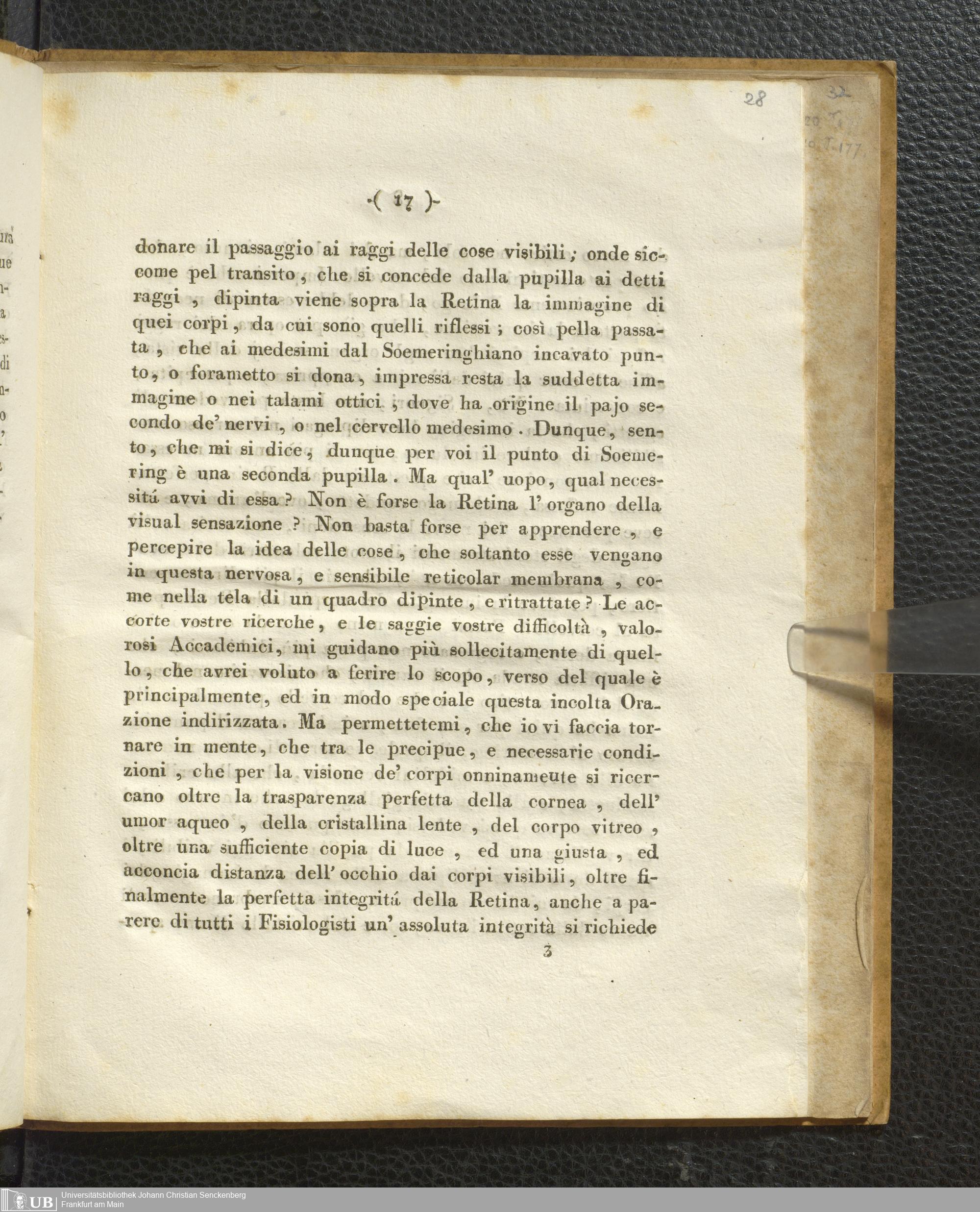 Soe 48 - Foramen centrale. Handexemplar von: Il Discorso del Dottore Felice Santis, Professore di medicina nella Università, Sull’uso, ed officio del Punto scoperto da Soemering nel fondo dell’occhio umano. Perugia, 1816. Mit umfangreichen Notizen/Exzerpten Soemmerrings.