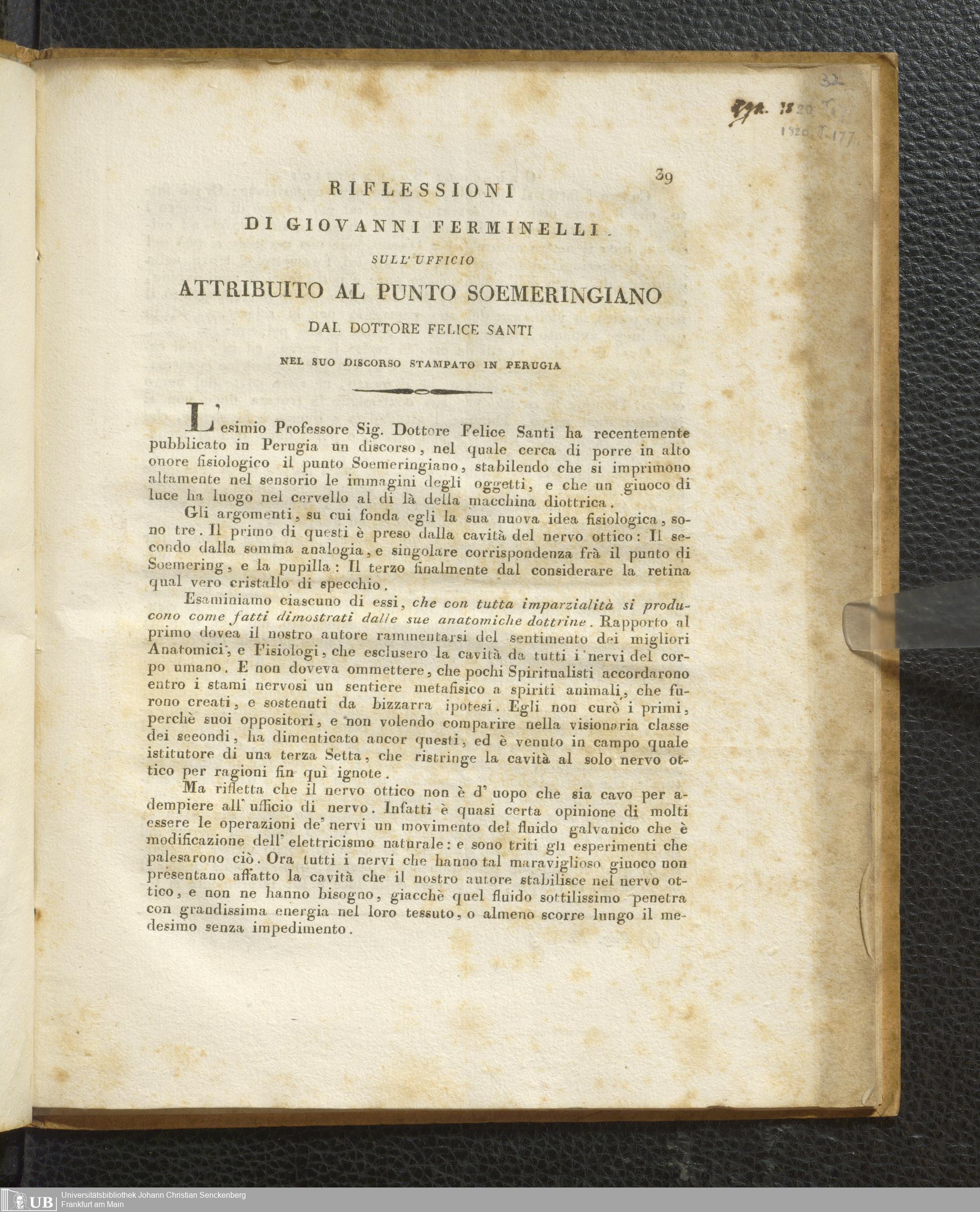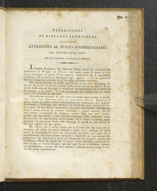 Soe 48 - Foramen centrale. Handexemplar von: Il Discorso del Dottore Felice Santis, Professore di medicina nella Università, Sull’uso, ed officio del Punto scoperto da Soemering nel fondo dell’occhio umano. Perugia, 1816. Mit umfangreichen Notizen/Exzerpten Soemmerrings.