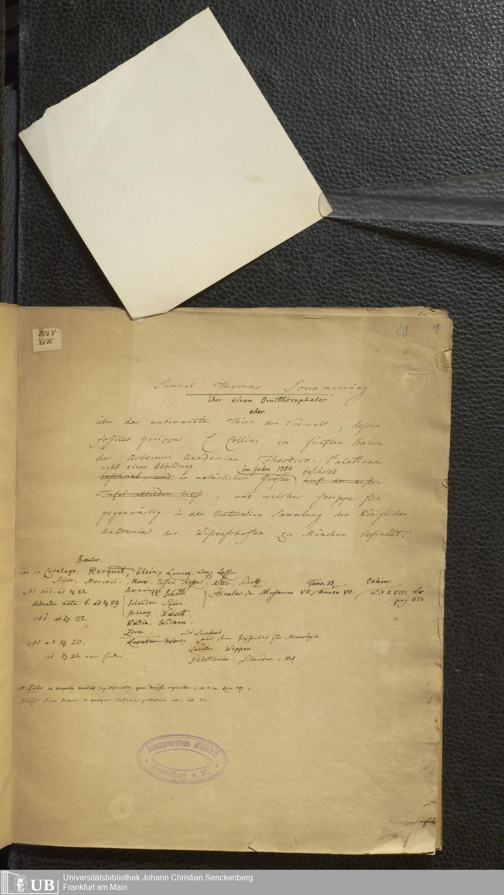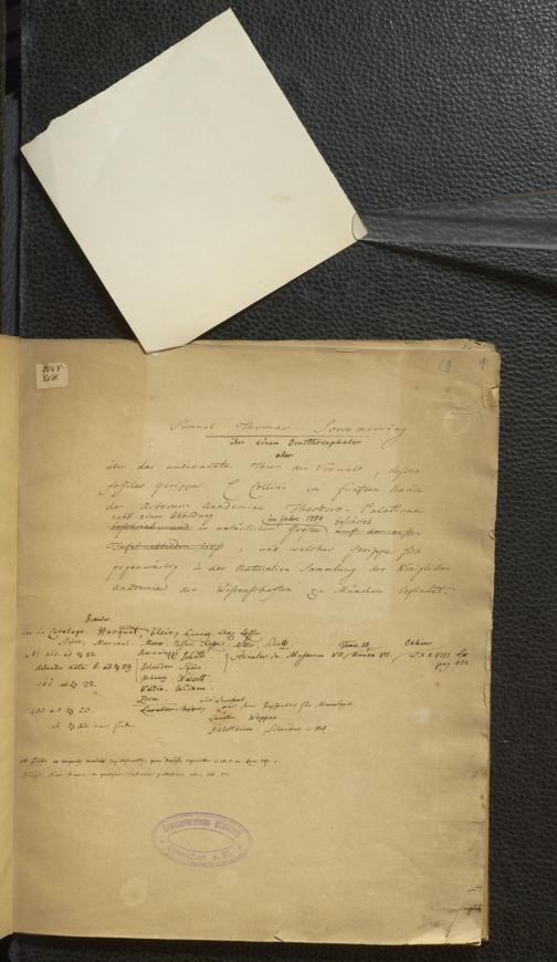 Soe 45 - Über einen Ornithocephalos oder über das unbekannte Thier der Vorwelt, dessen fossiles Gerippe C. Collini im fünften Bande der Actorum Academiae Theodoro-Palatinae nebst einer Abbildung in natürlicher Grösse im Jahre 1784 beschrieb, und welches Gerippe sich gegenwärtig in der Naturalien Sammlung der Königlichen Academie der Wissenschaften zu München befindet.