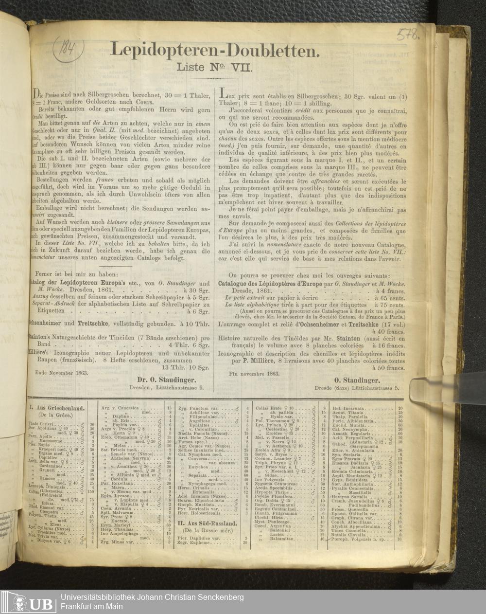 4˚ Hs 11 Bd. 6 - Entomologische Correspondenz von Karl Heinrich Georg von Heyden. Sa/Stei