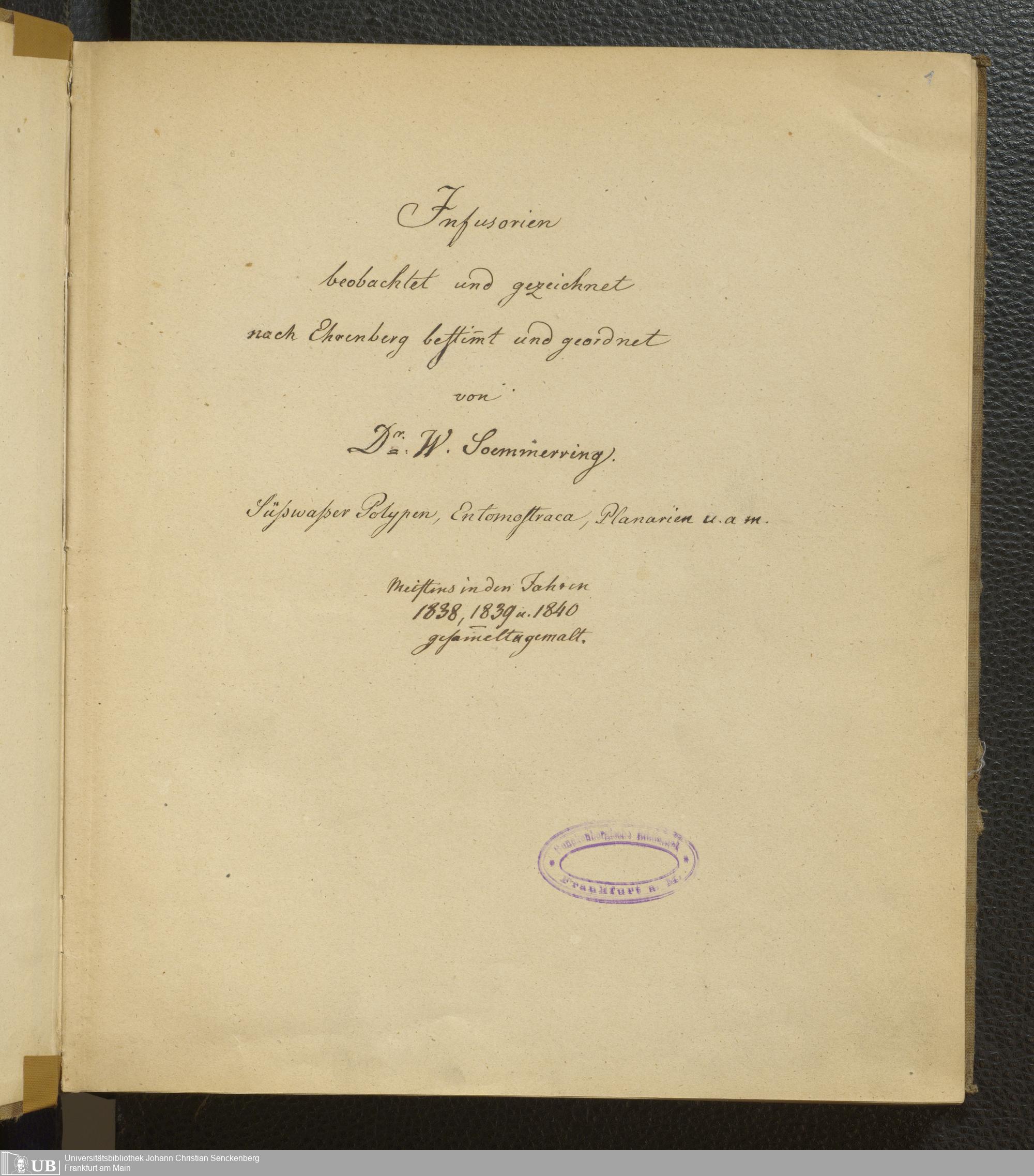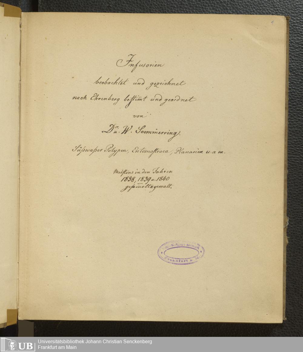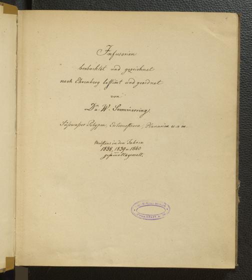 Soe 65 - Infusorien : beobachtet und gezeichnet, nach Ehrenberg bestim[m]t und geordnet von Dr. W. Soemmerring. Süßwasser Polypen, Entomostraca, Planarien u.a.m. Meistens in den Jahren 1838, 1839 u. 1840 gesam[m]elt u. gemalt