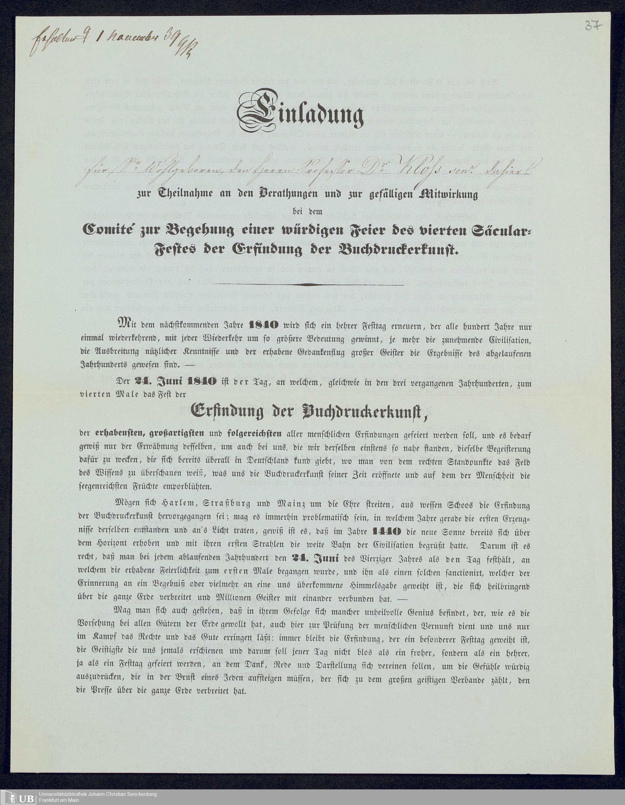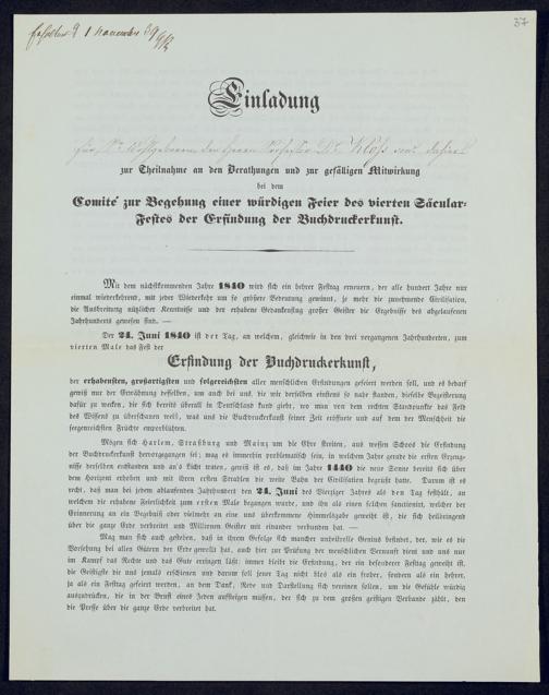 Ms. Ff. G. Kloß VI.6 - Drucksachen und weitere Unterlagen zur Säcularfeier der Erfindung der Buchdruckerkunst 1840