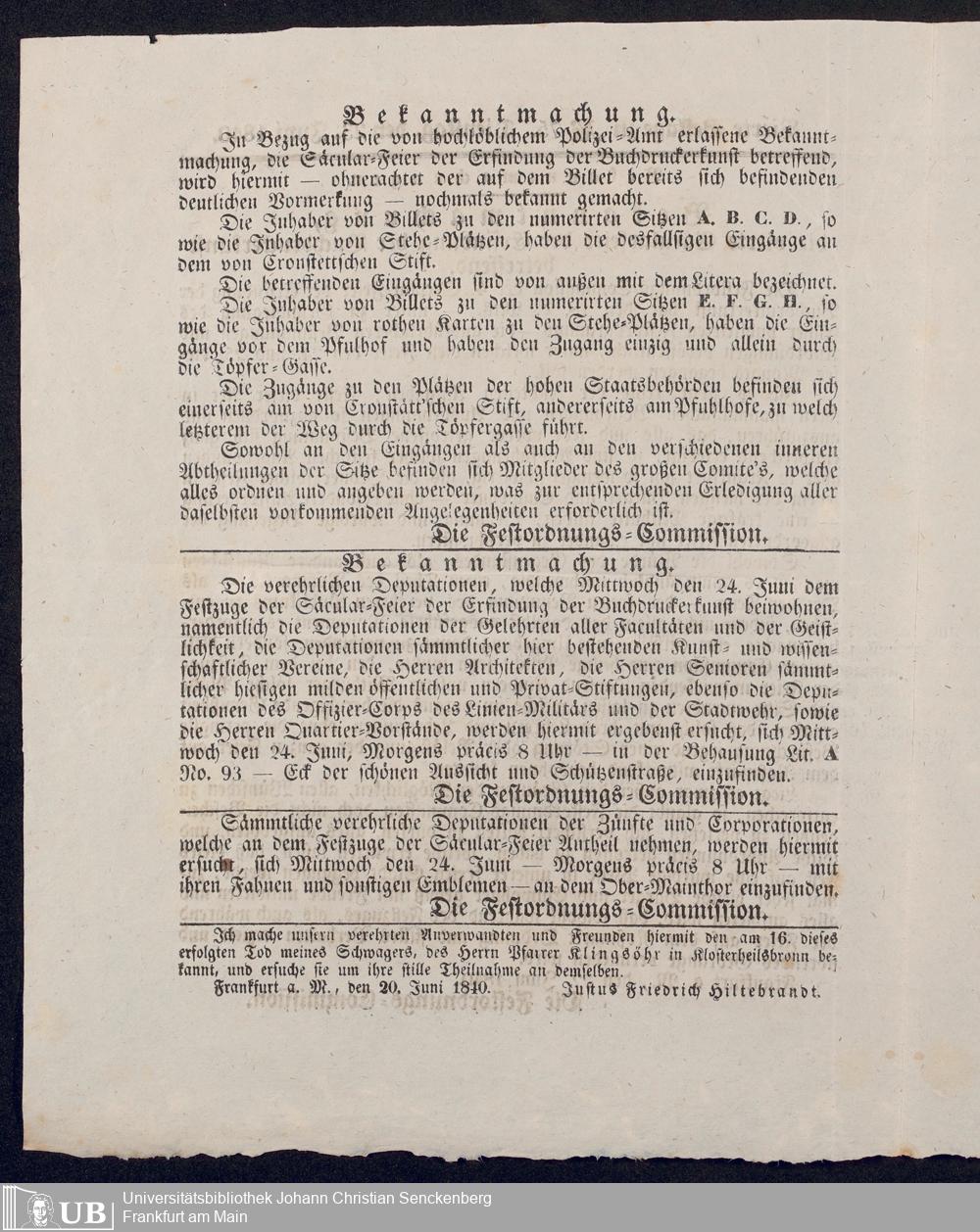 Ms. Ff. G. Kloß VI.6 - Drucksachen und weitere Unterlagen zur Säcularfeier der Erfindung der Buchdruckerkunst 1840